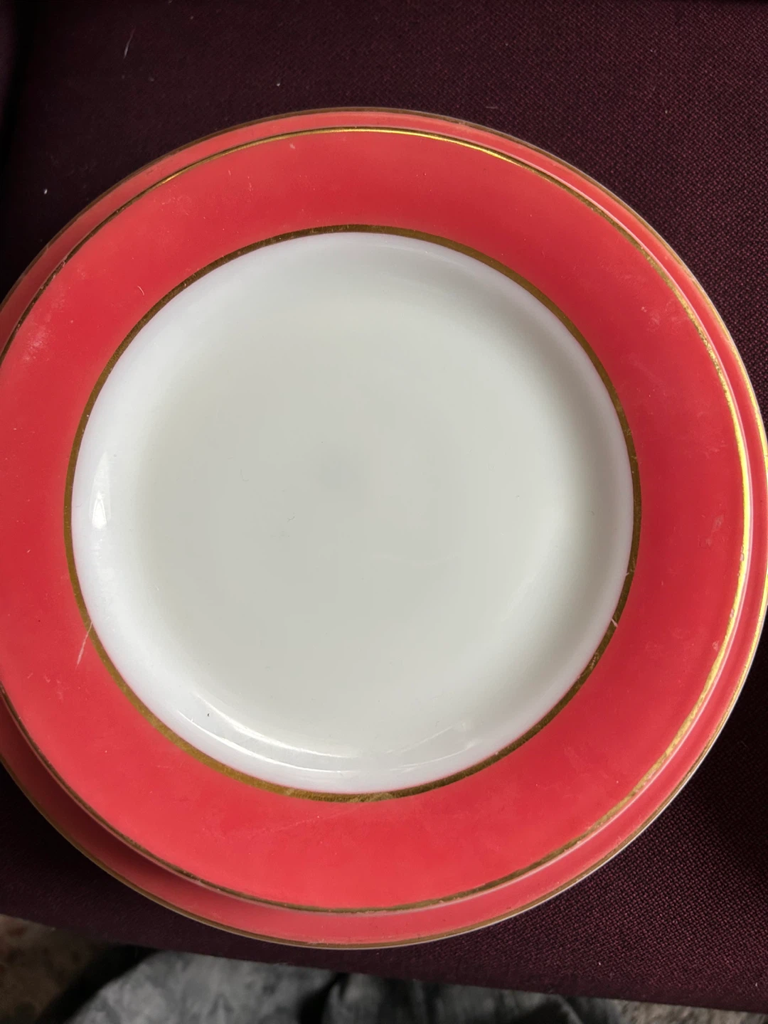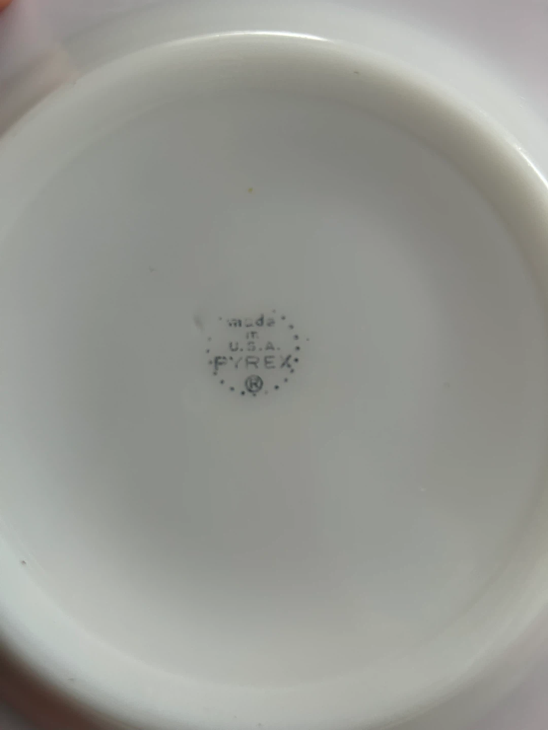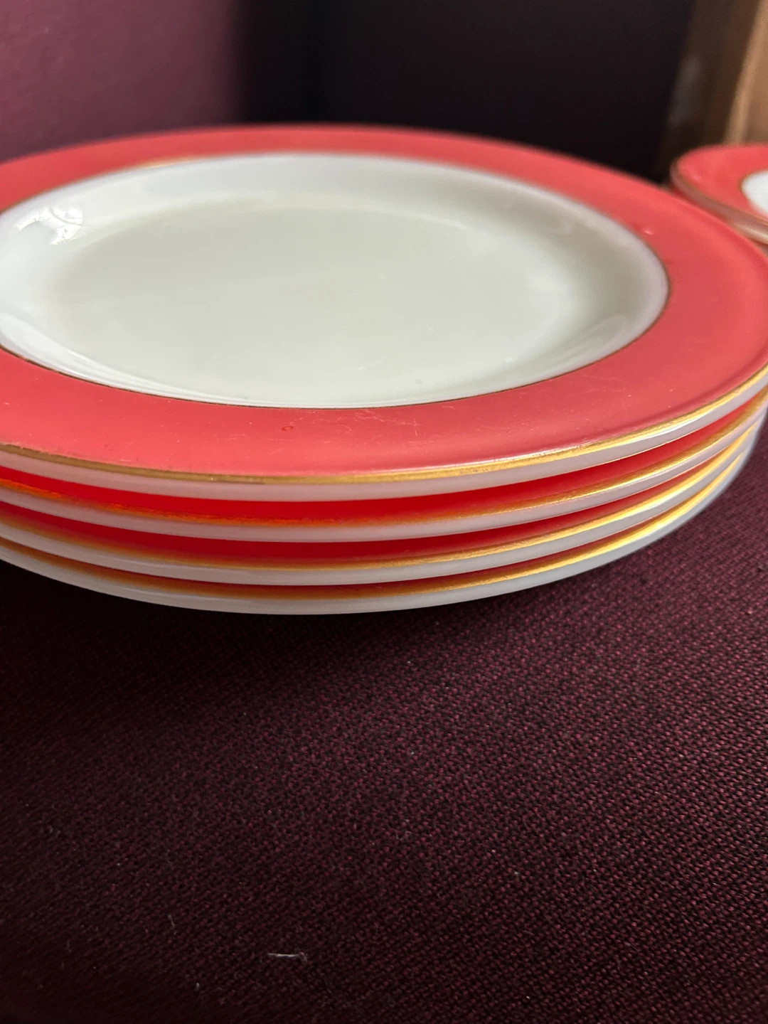 Selling a set of bowls and plates with a coral rim. They have a lovely gold trim. Perfect for adding a pop of colour to your table setting! This is a set of 4 big bowls medium bowls am d4 bowls. These are pyrex. Very nice shape.
