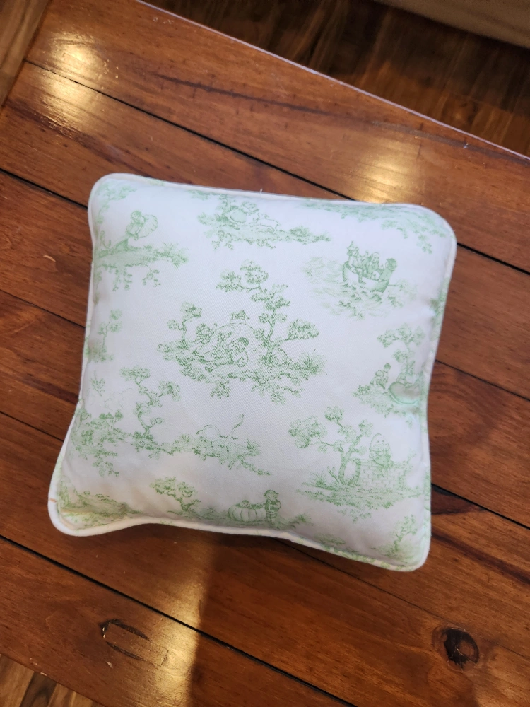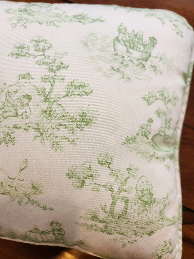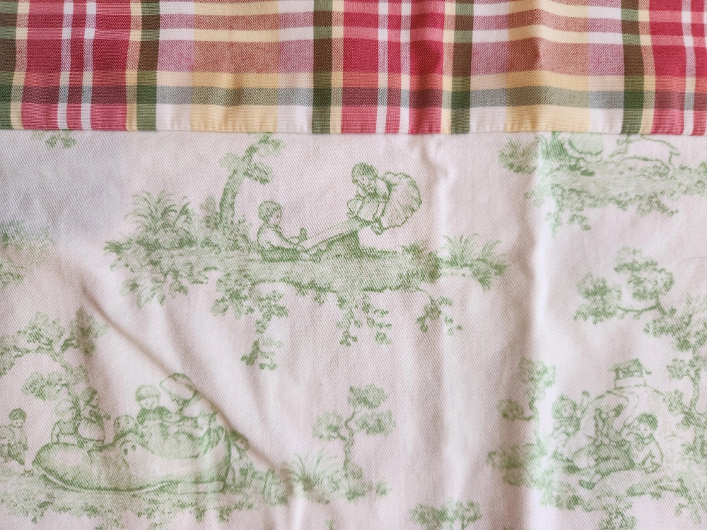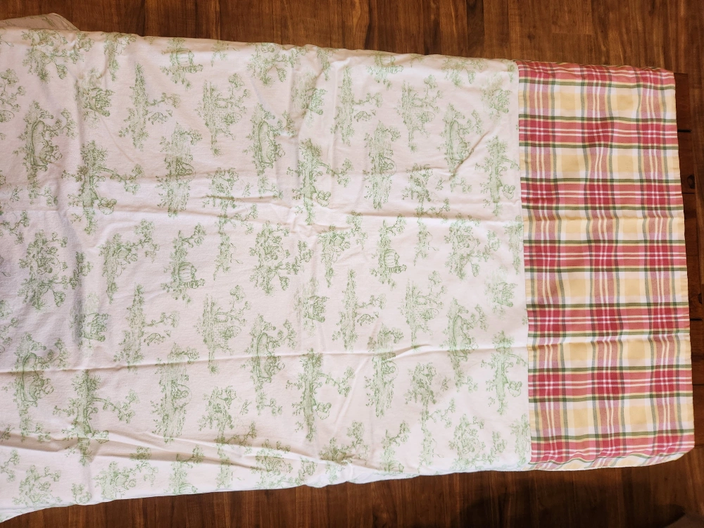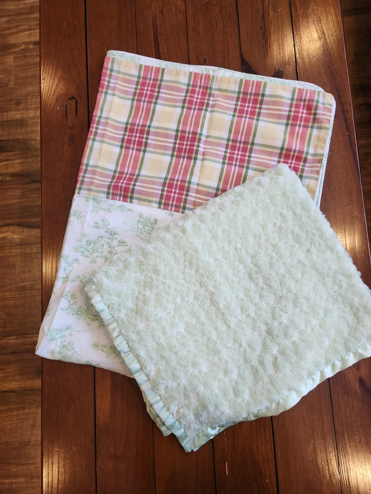 Charming baby crib bedding set. Includes a two quilts and a pillow. Features a toile print with green accents. Plaid accents on quilt. Soft and cozy fabrics. Perfect for a nursery.