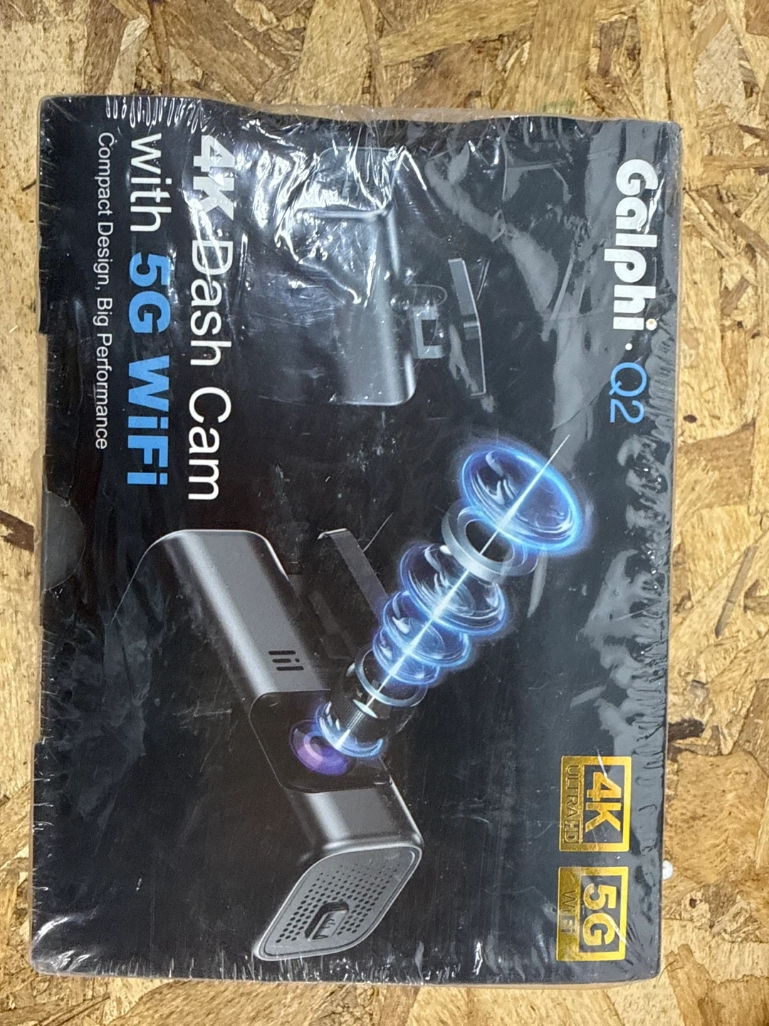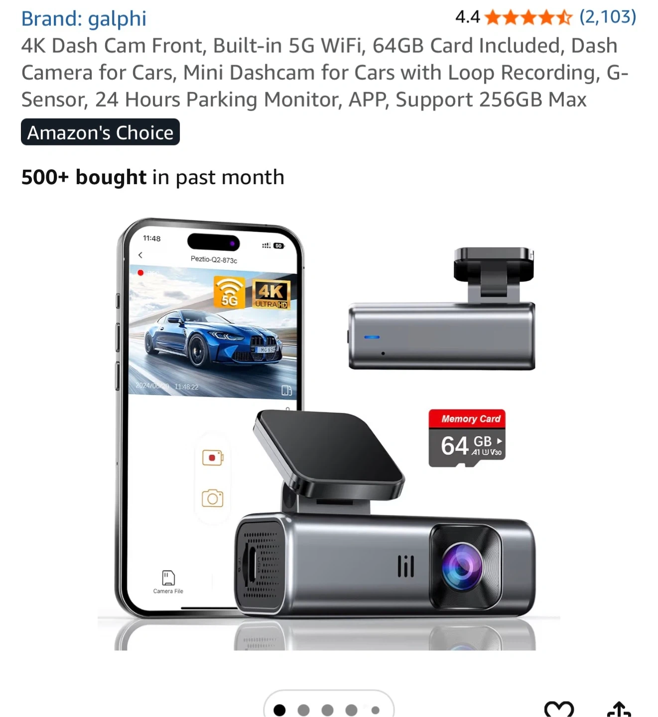 This is a Galpha Q2 dash cam with 4K resolution and 5G WiFi. It's a compact design with 64GB card included. The dash cam offers a 24-hour parking monitor and supports 256GB max memory.
