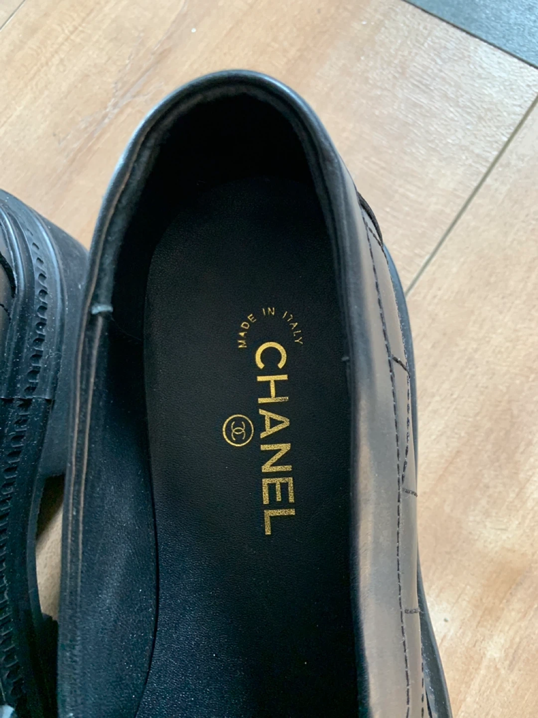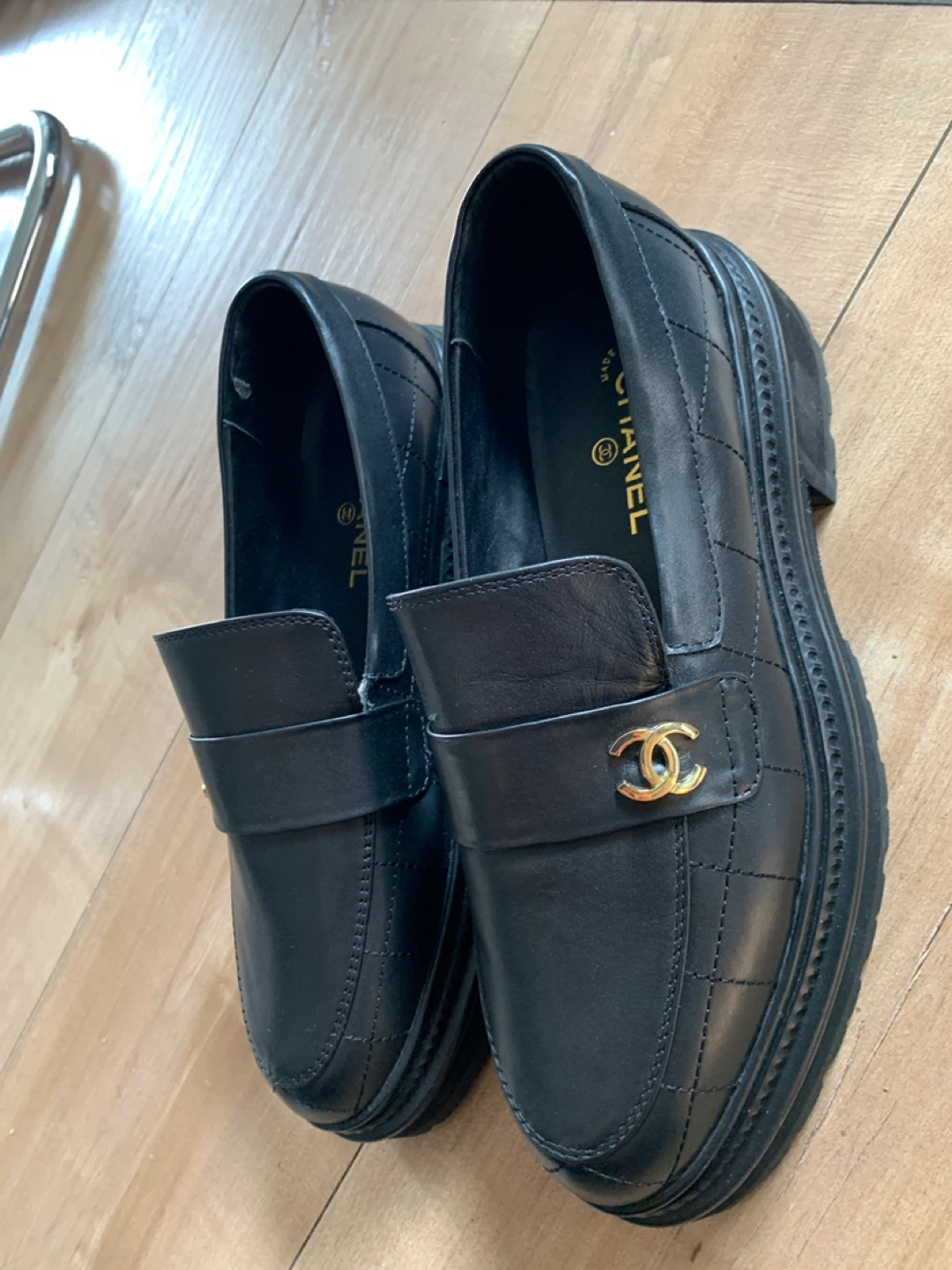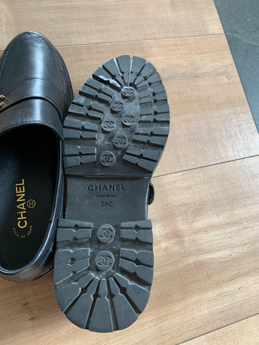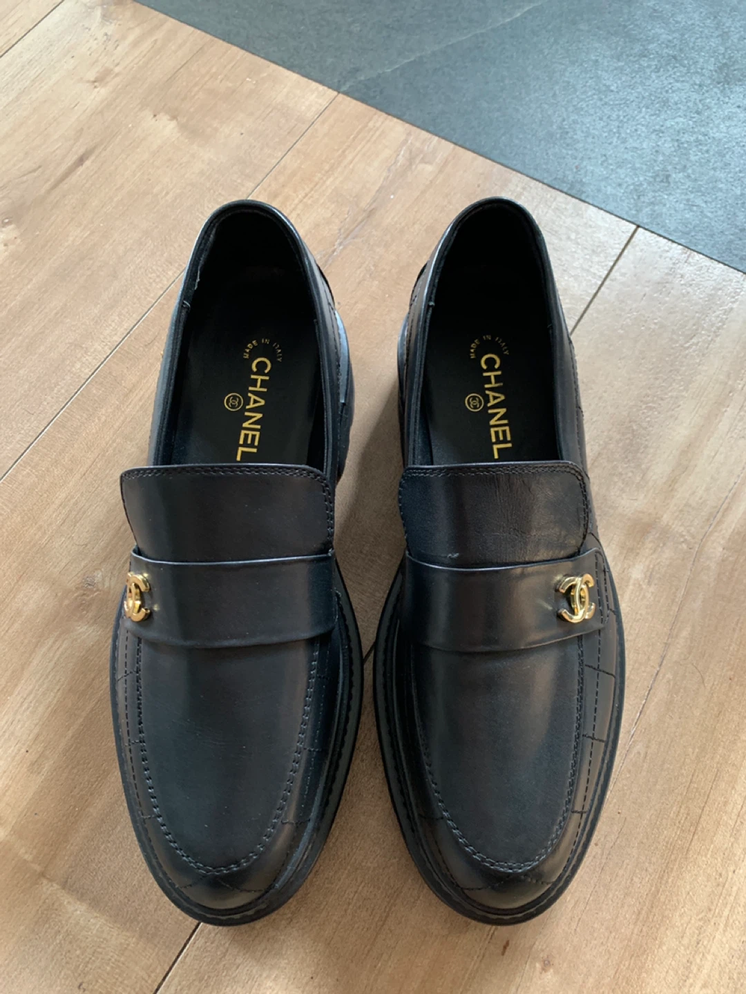 Classic CHANEL black leather loafers with gold CC emblem. Made in Italy. These loafers feature a quilted design on the vamp and a chunky lug sole. Size 39C.