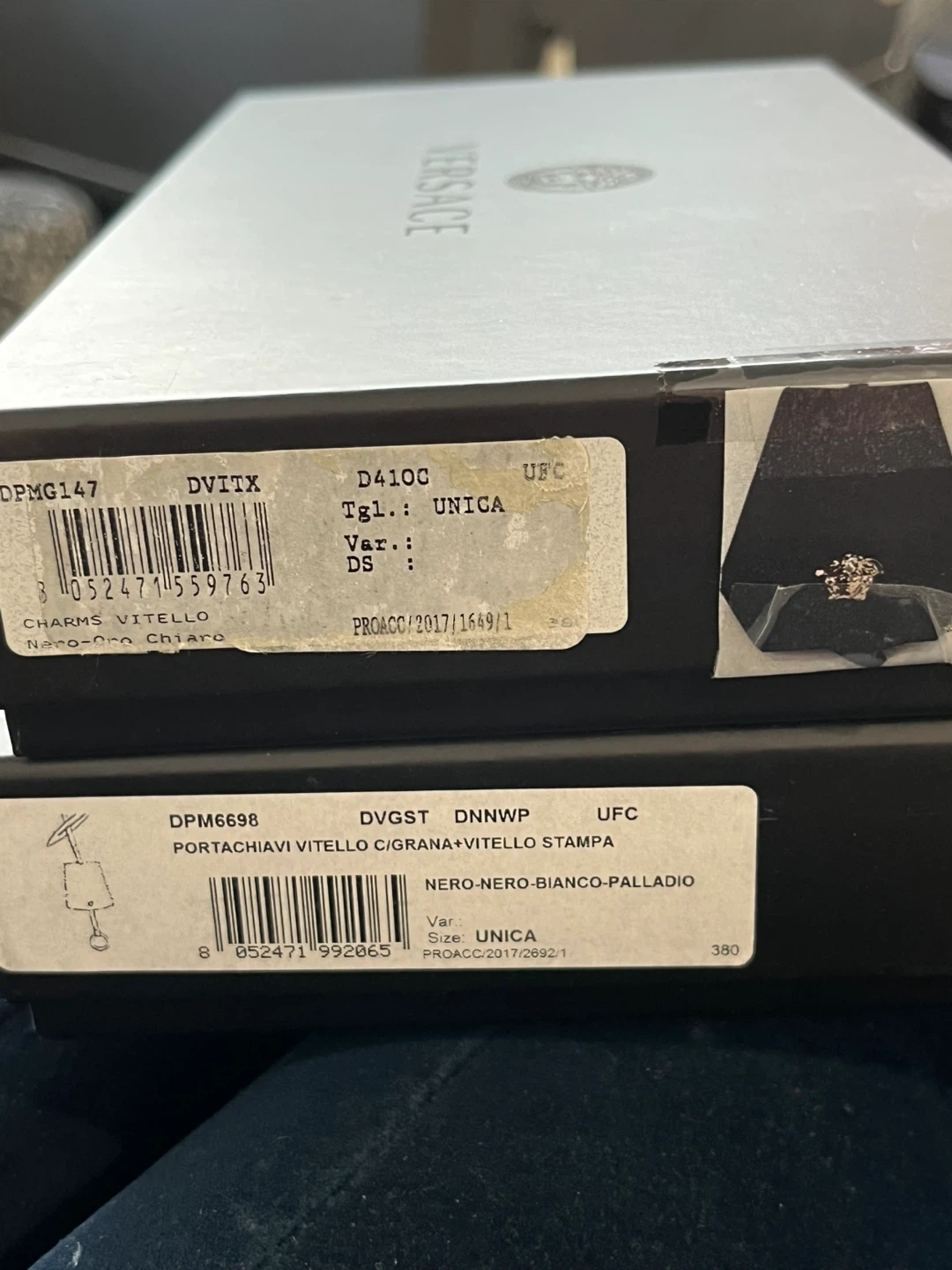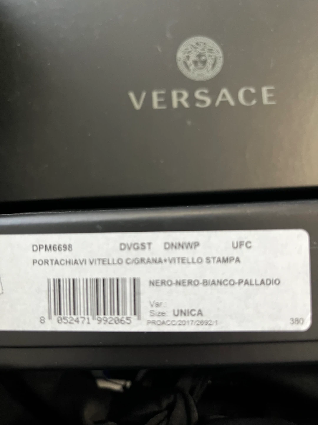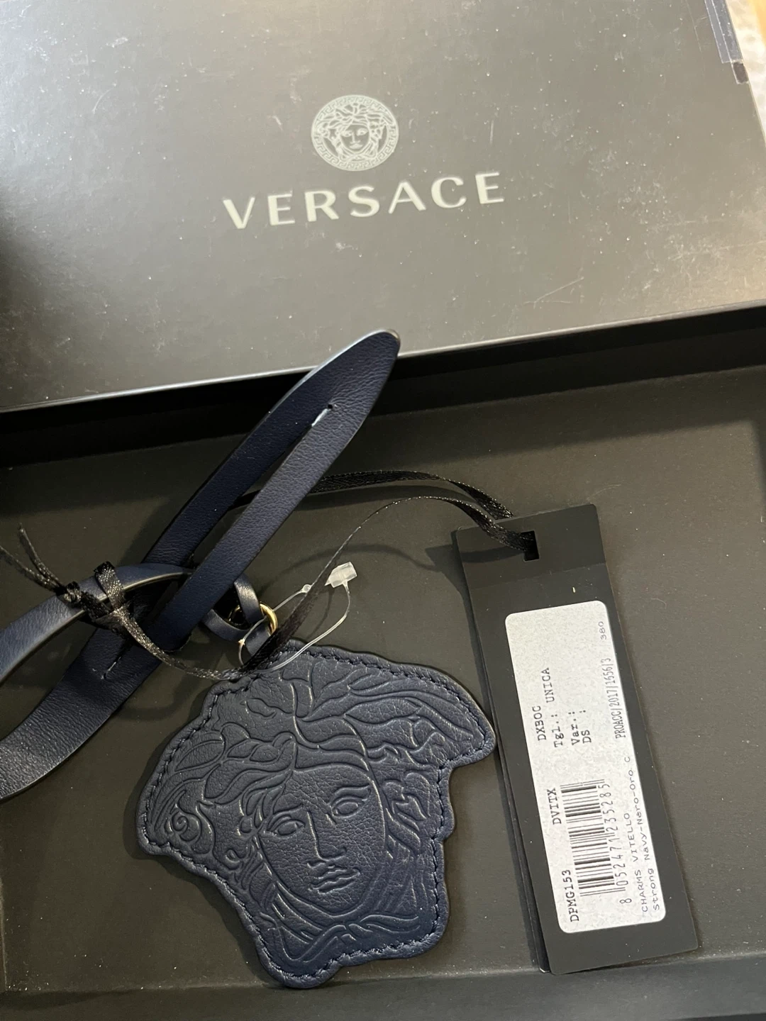 Selling a few Versace leather keychains. They are brand new and come with the original box. Available in Nero-Nero-Bianco-Palladio (Black), Navy, and Turquoise. The size is UNICA.