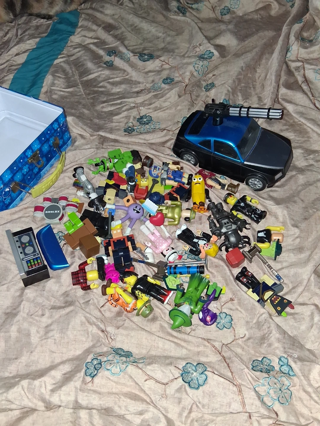 A collection of Roblox action figures and accessories, including a police-style vehicle with mounted gun. It also comes with a tin lunchbox featuring a SpongeBob design. Lots of fun characters and weapons included!