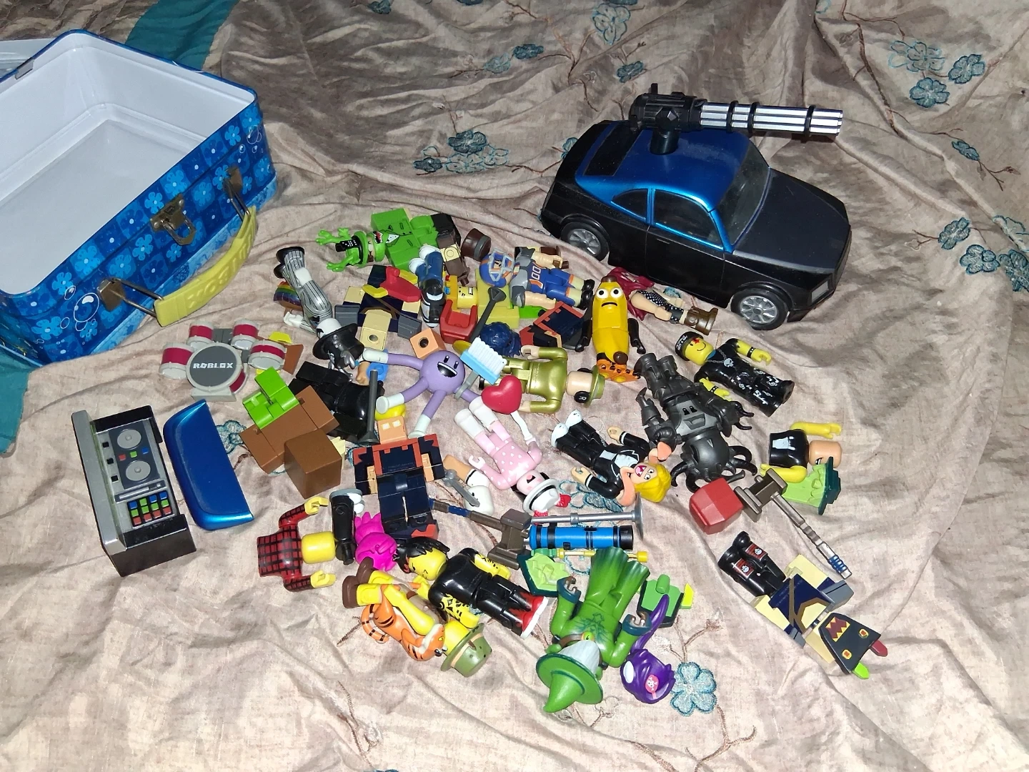 A collection of Roblox action figures and accessories, including a police-style vehicle with mounted gun. It also comes with a tin lunchbox featuring a SpongeBob design. Lots of fun characters and weapons included!