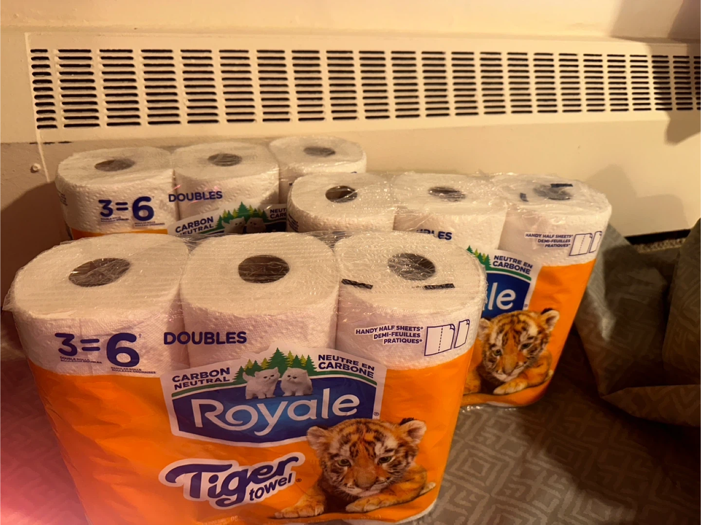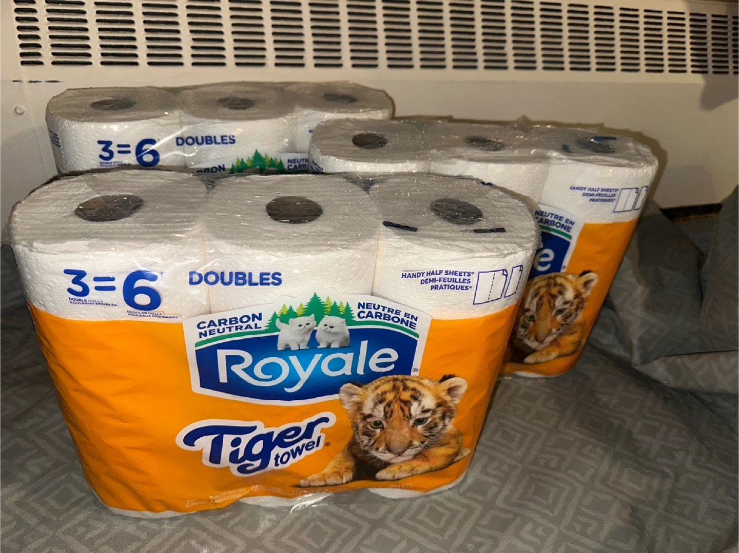 All three packs are for 5 This is a 6-pack of Royale Tiger Towel paper towels. They're double rolls, so each pack is equivalent to 6 regular rolls. Carbon neutral product.