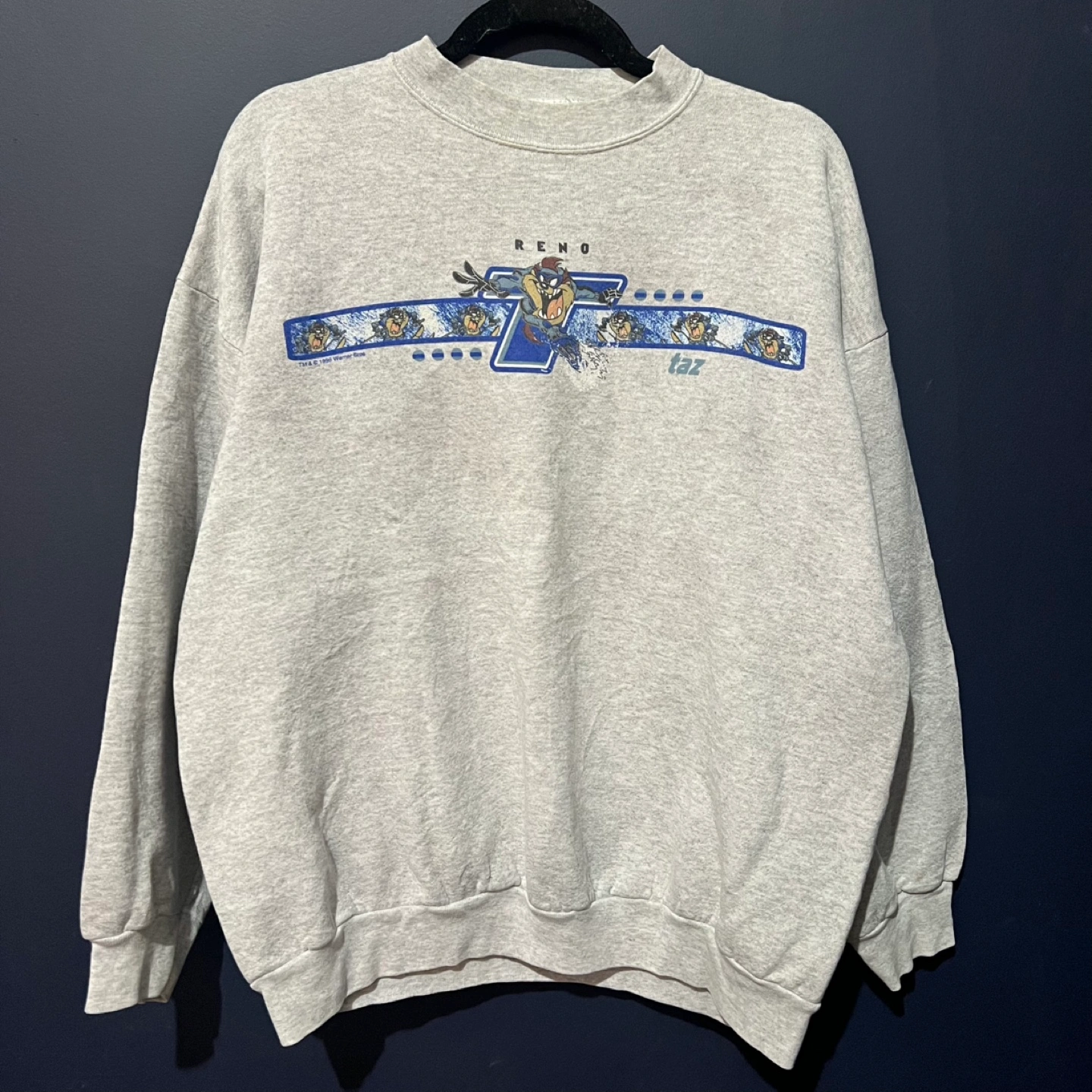Selling a vintage Taz Reno crewneck sweatshirt. It features Taz from Looney Tunes. The sweatshirt is grey with a blue and white graphic. Great for any Looney Tunes fan!