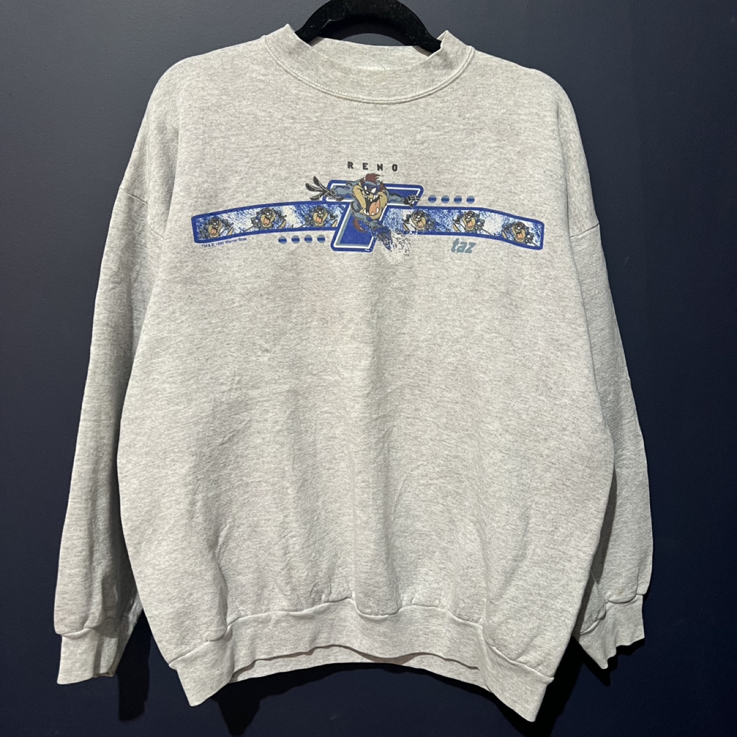 Selling a vintage Taz Reno crewneck sweatshirt. It features Taz from Looney Tunes. The sweatshirt is grey with a blue and white graphic. Great for any Looney Tunes fan!