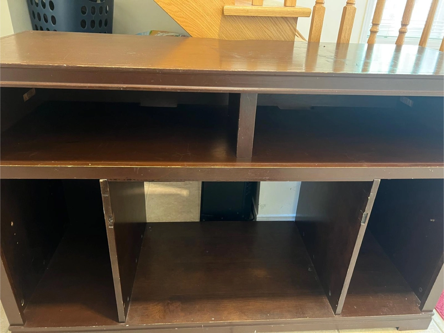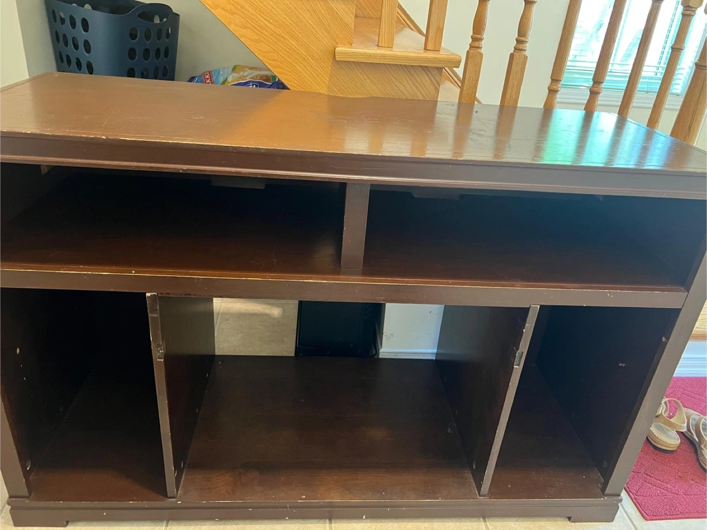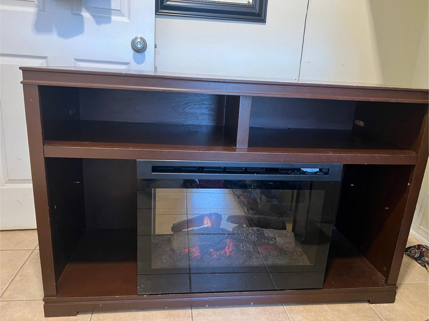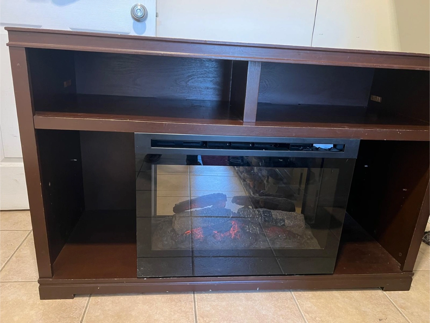 Selling a brown fireplace TV stand. It has some signs of use, as you can see in the photos, but it's still a functional piece of furniture for your living room or entertainment area