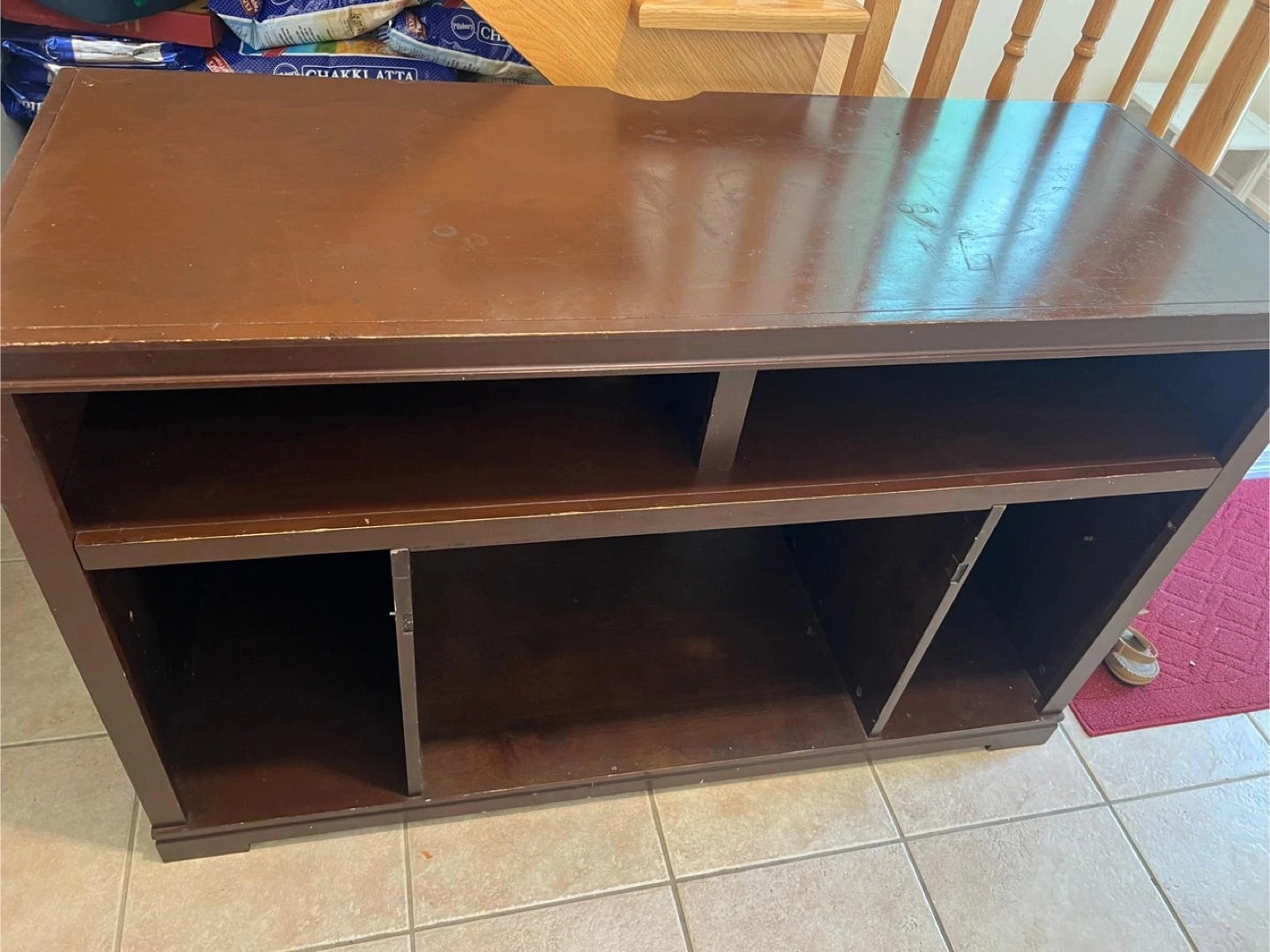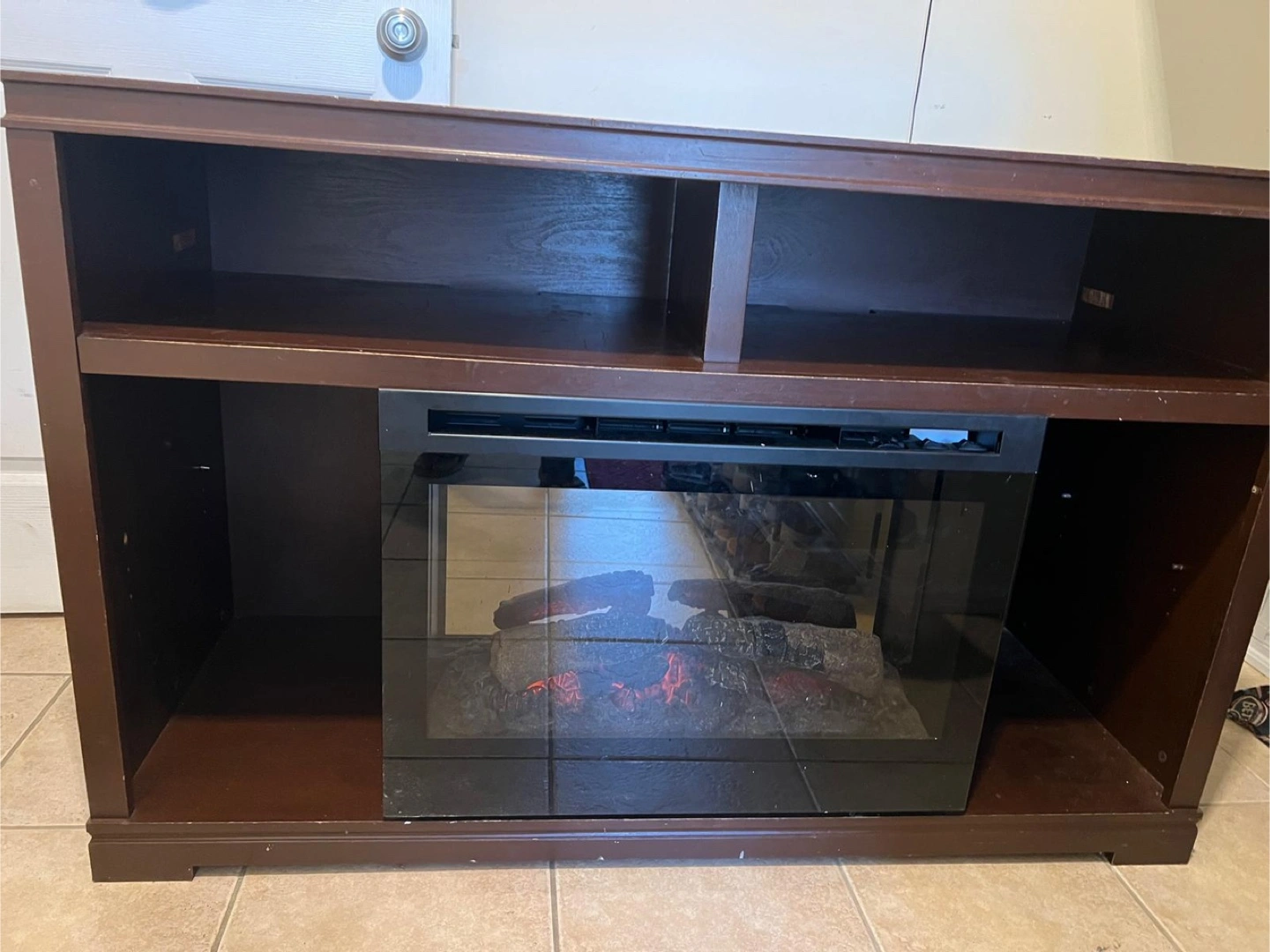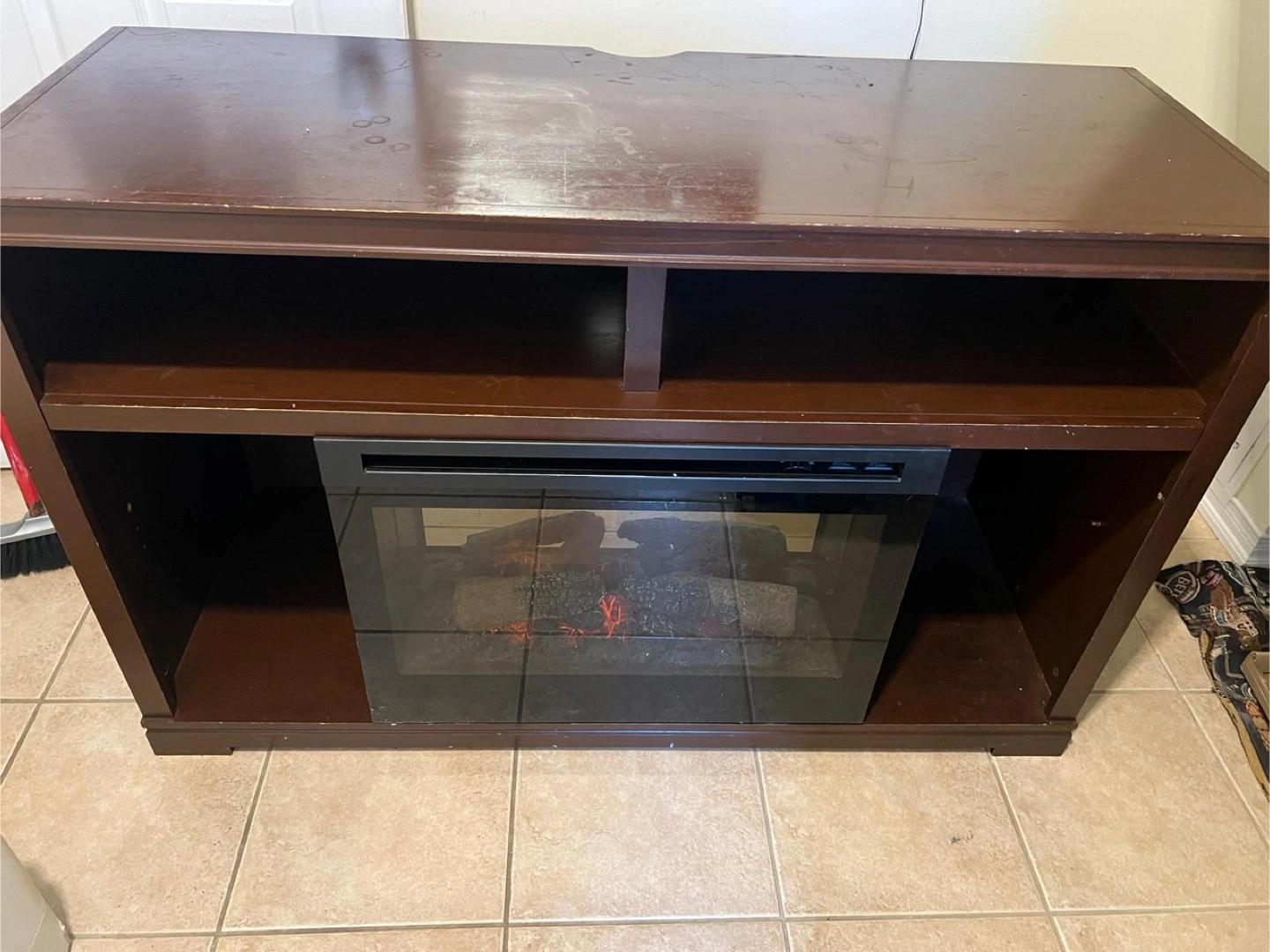 Selling a brown fireplace TV stand. It has some signs of use, as you can see in the photos, but it's still a functional piece of furniture for your living room or entertainment area