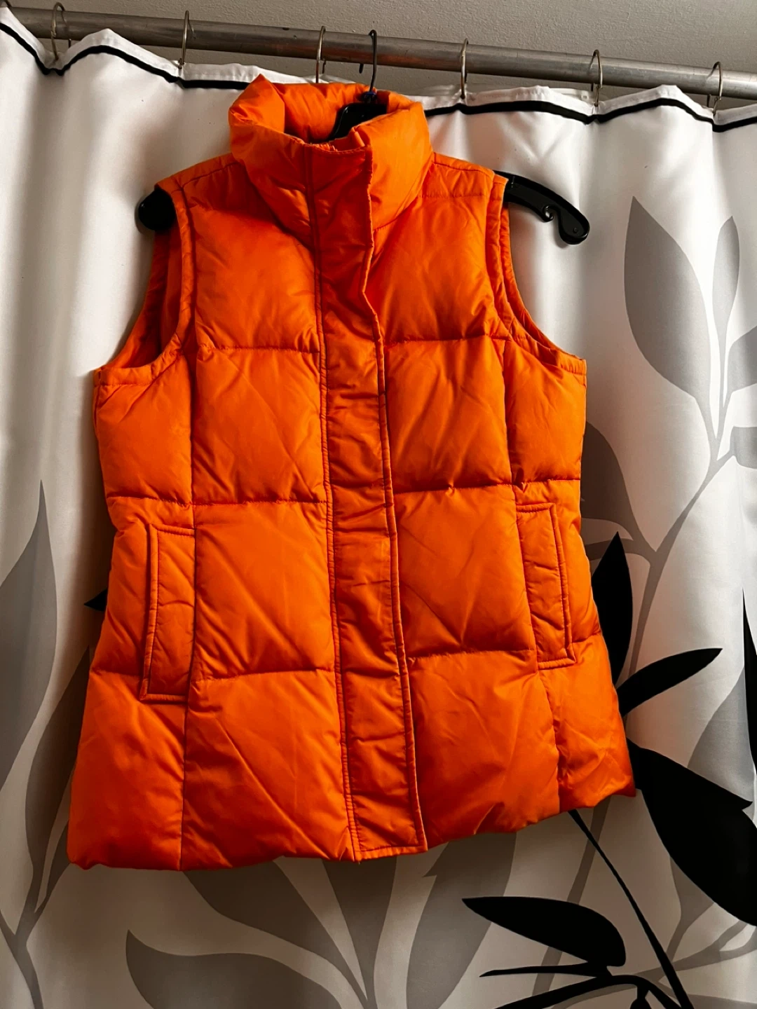 This Joe Fresh puffer vest is a bright orange colour. It's a size S/P. The lining is 100% polyester and the fill is 60% down and 40% waterfowl feathers. It's great for layering when it's cool out! Worn only once.