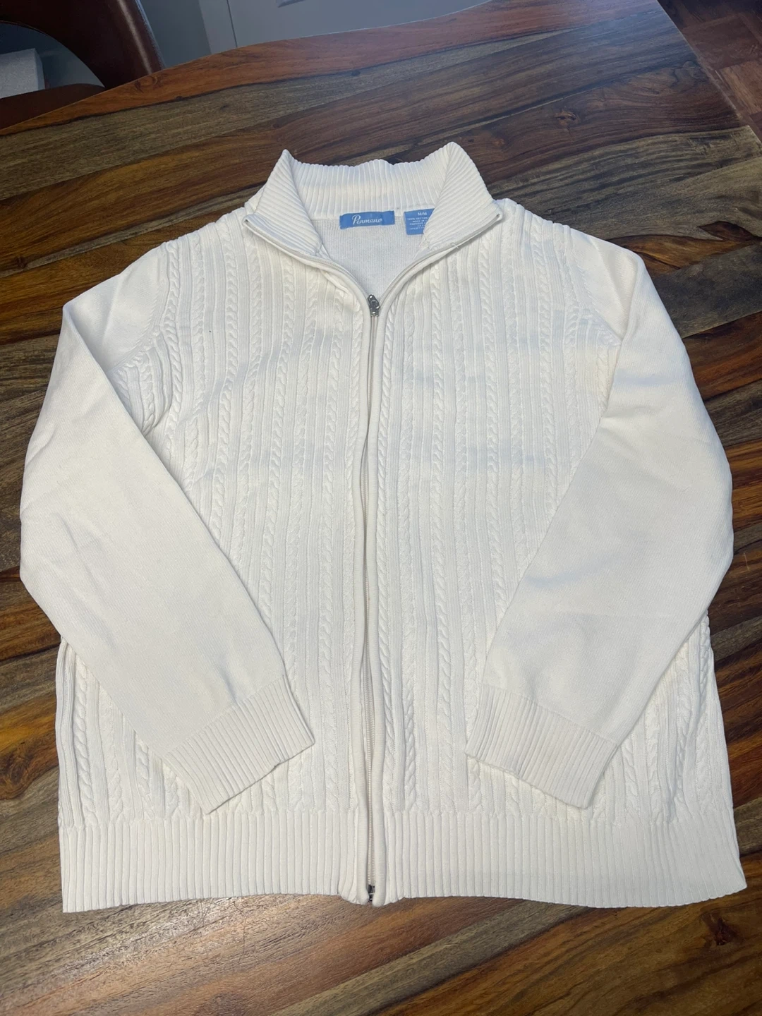 Comfortable white cable knit cardigan with a full zip closure. It's made from a soft material for everyday wear. Machine washable.
