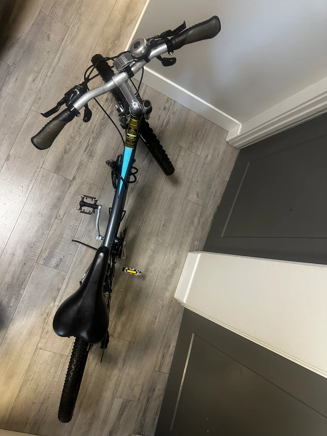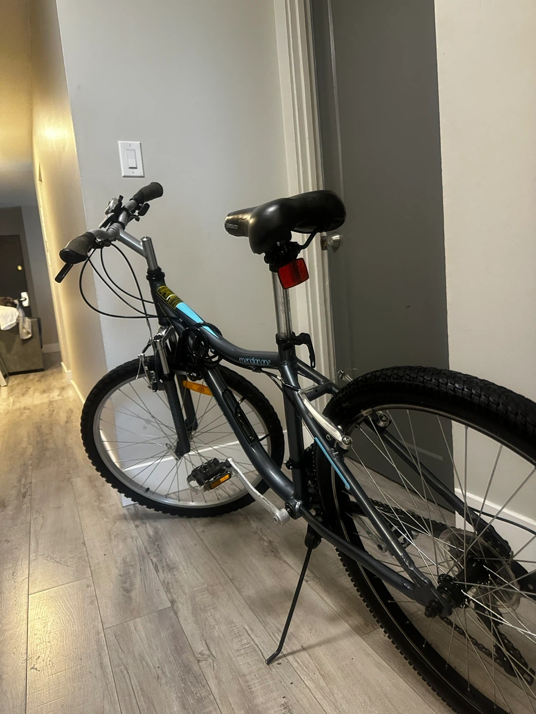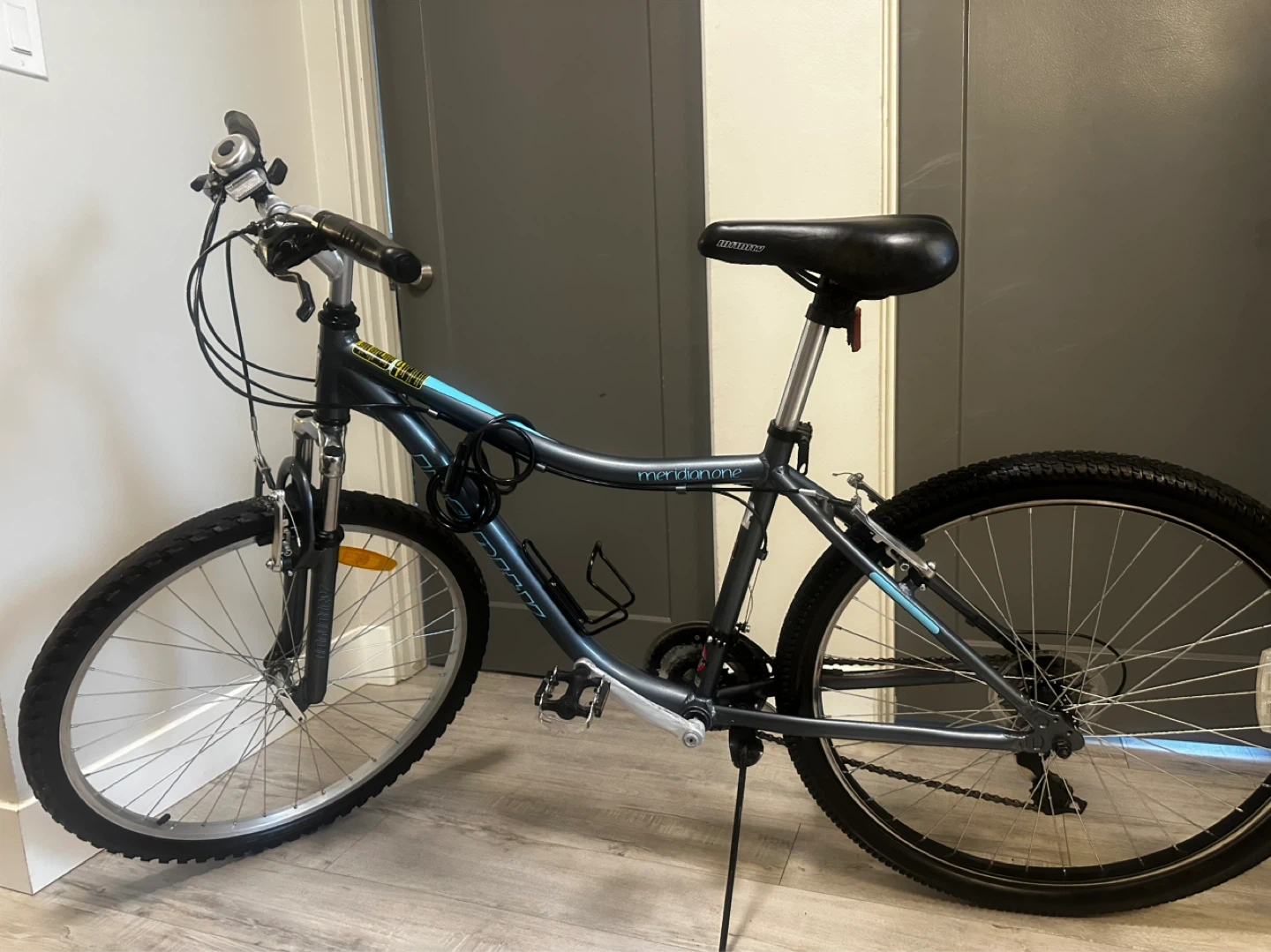 This is a mountain bike with a grey frame and black seat. It has a kickstand and a bell. The tires are suitable for various terrains. It's ready for your next adventure!