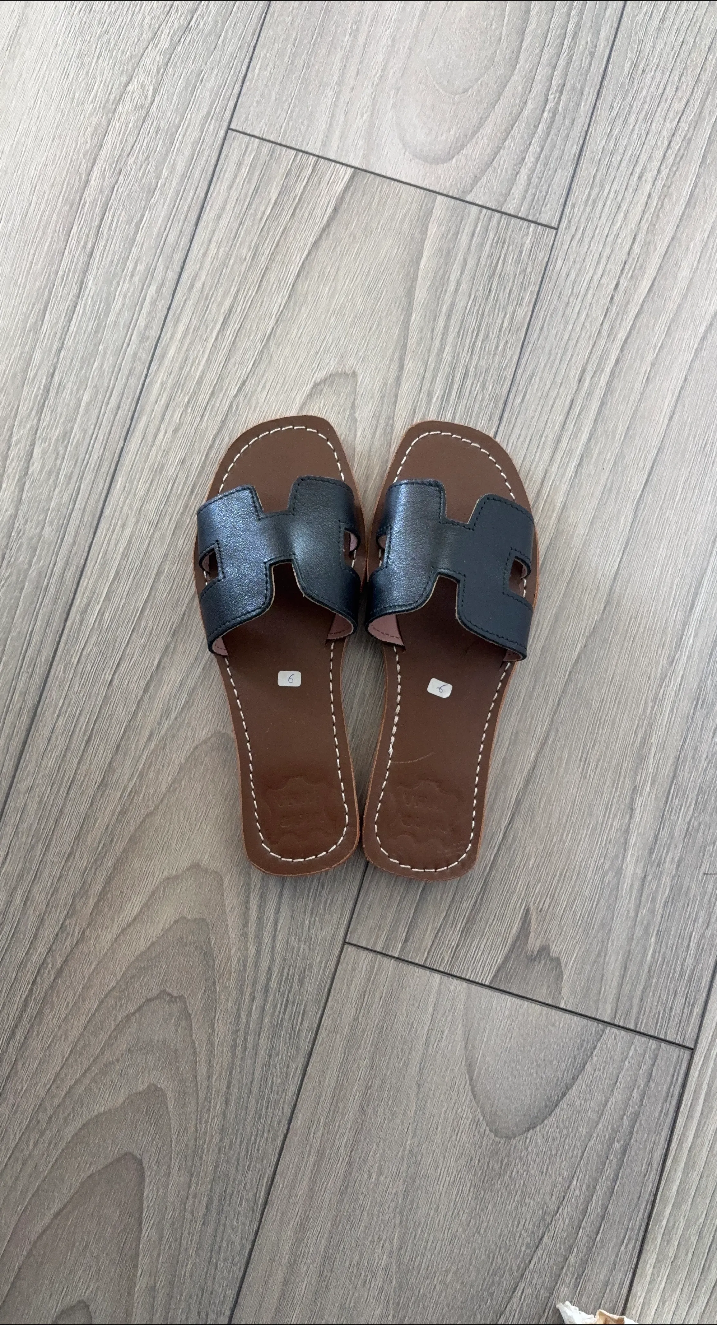 Cute pair of leather 'H' sandals in size 6. They have a brown base with a black 'H' design on top. Perfect for summer!