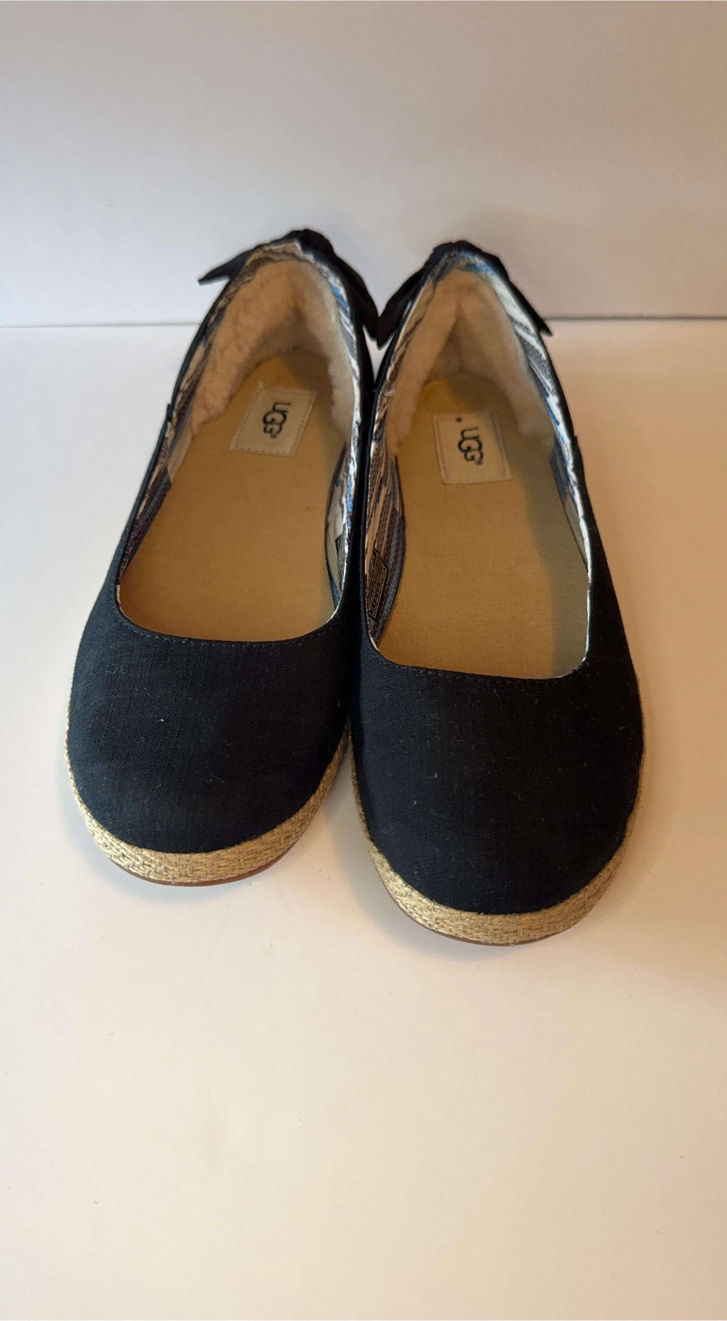 UGG black ballet flats with a comfortable espadrille sole. These flats feature a cozy, patterned lining and a small bow detail at the heel. Perfect for casual wear!