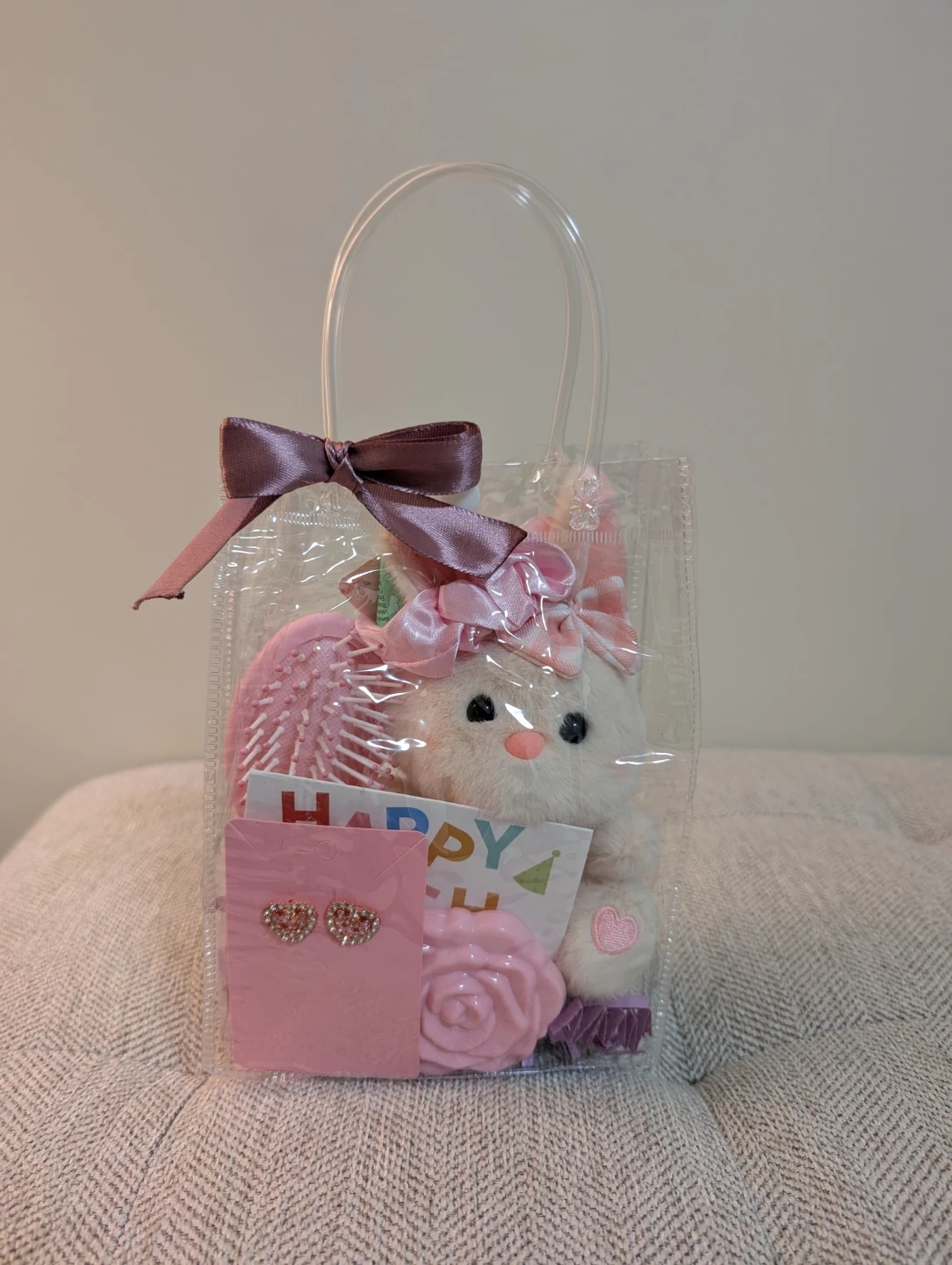 This sweet gift bag includes a plush bunny, hair brush, scrunchie, rose-shaped soap, and sparkly heart earrings. It also comes with a 'Happy Birthday' card. Perfect for a young child's special day!