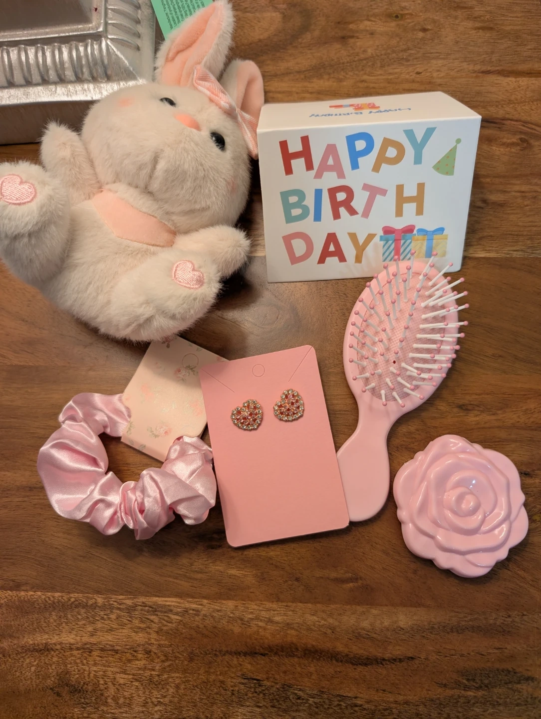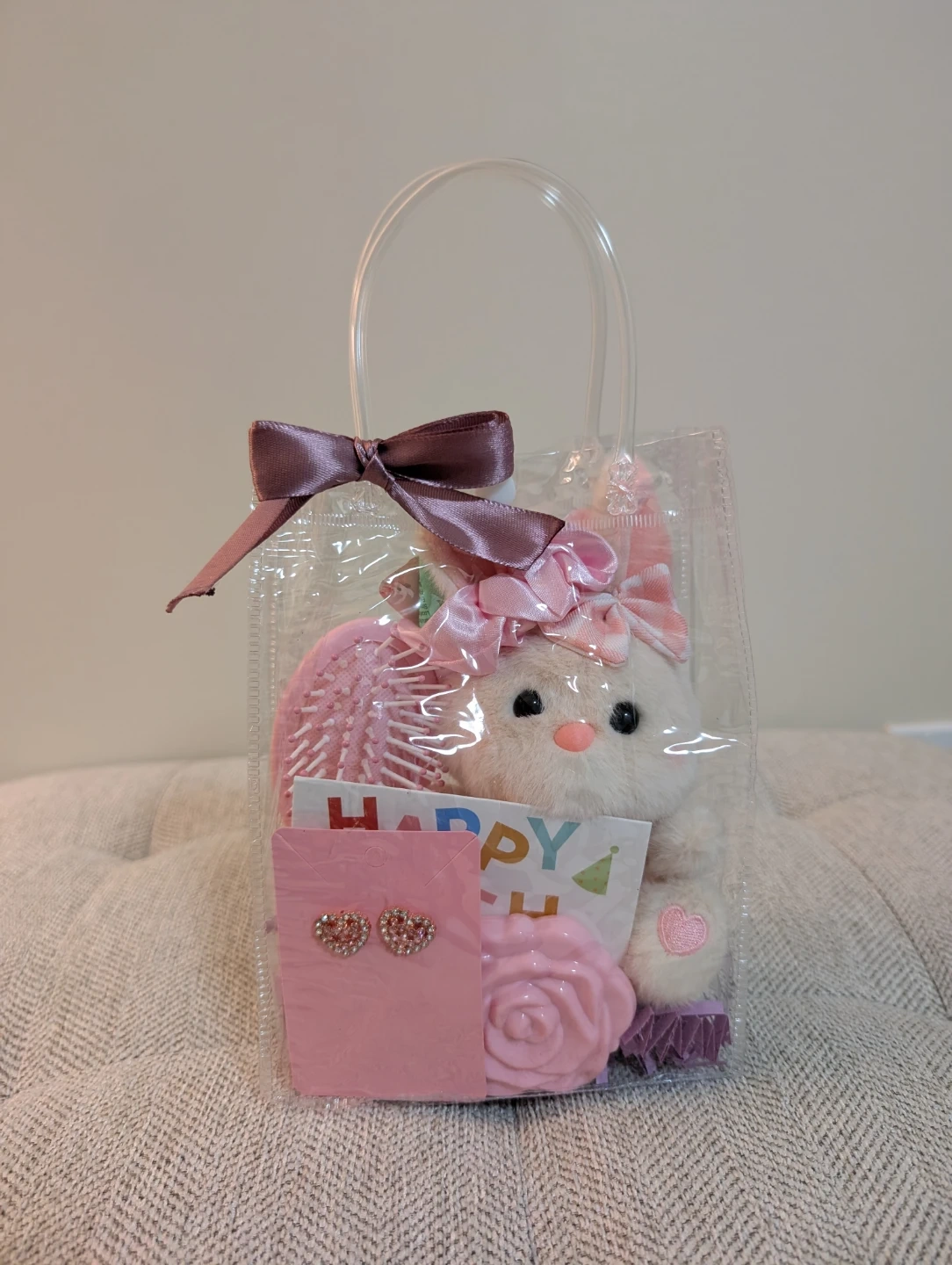 This sweet gift bag includes a plush bunny, hair brush, scrunchie, rose-shaped soap, and sparkly heart earrings. It also comes with a 'Happy Birthday' card. Perfect for a young child's special day!