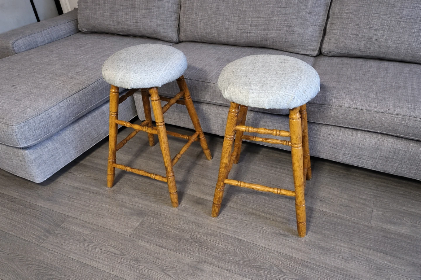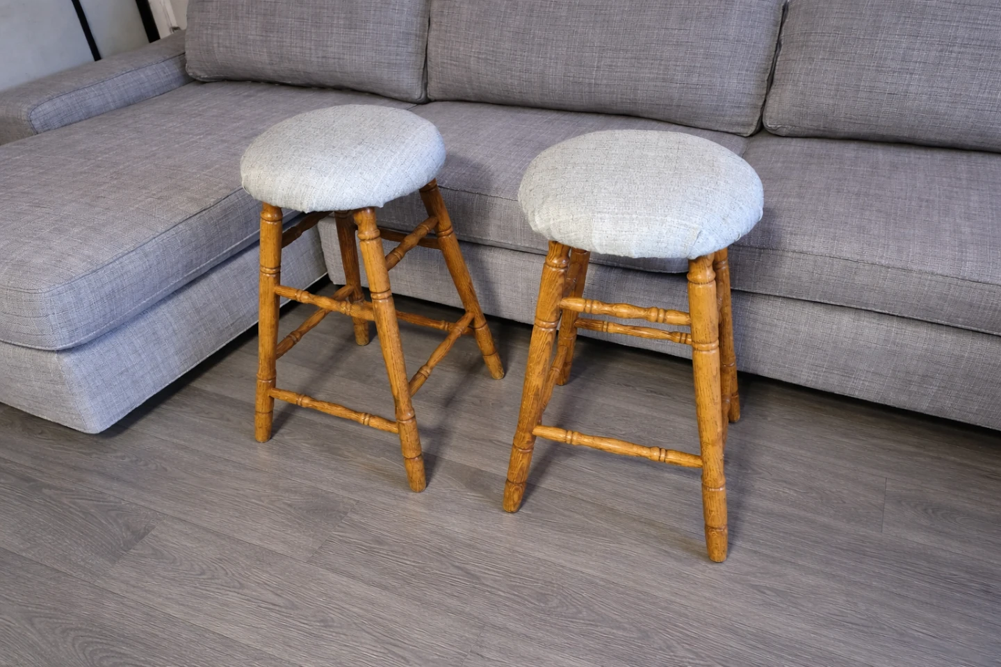 A pair of wooden bar stools with upholstered seats. These stools have a classic design with turned wood legs. They're perfect for a kitchen island or home bar.