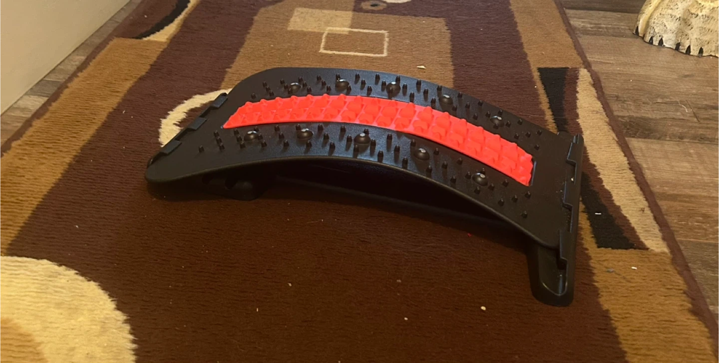 This is a back stretcher and lumbar support device. It's black with a red pad and has small massage points. Never been used just been sitting in my closet, it’s in excellent condition
