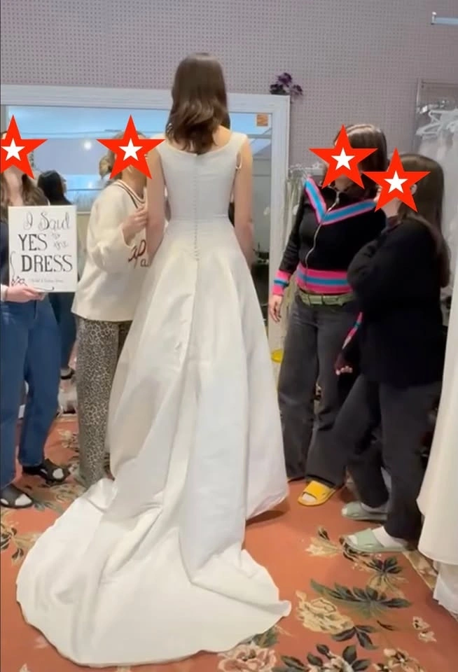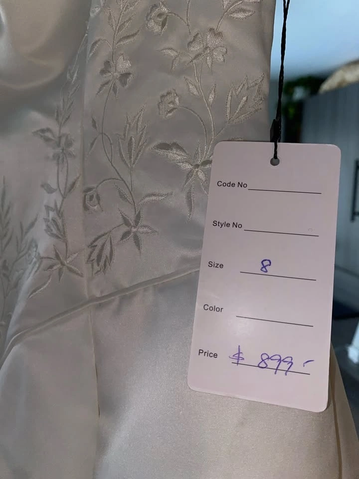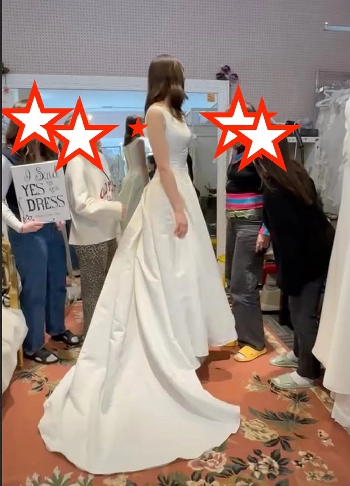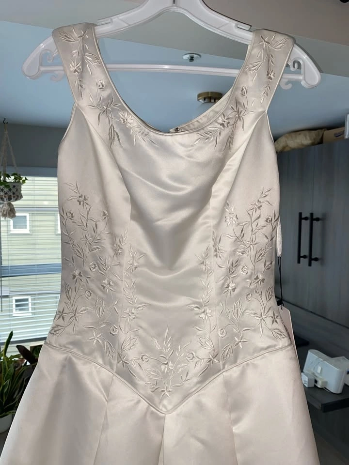 Selling a classic silhouette boat neck wedding dress with a super flattering Basque waist. This was bought off-the-rack and has never been worn (except to try on) and is unaltered. Since it's off-the-rack, it will need dry-cleaning, but it's in perfect, brand-new condition aside from what's expected from being in a shop (no snags, rips, or damage to the fabric).