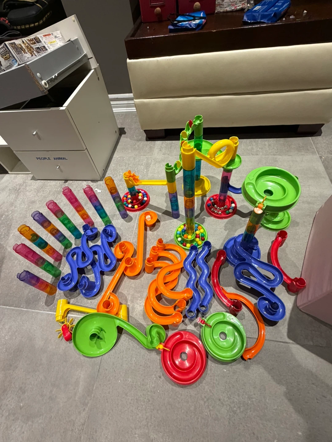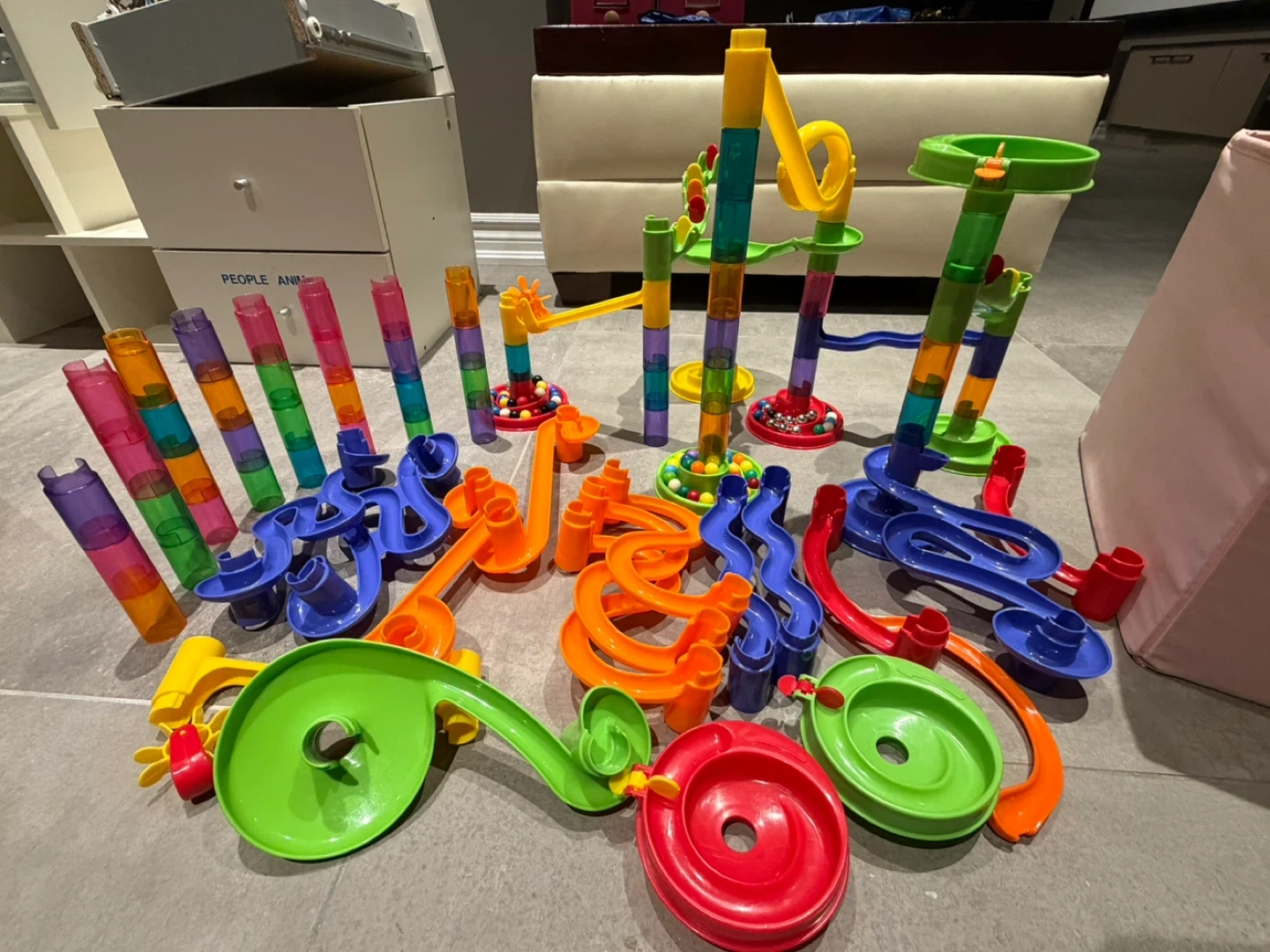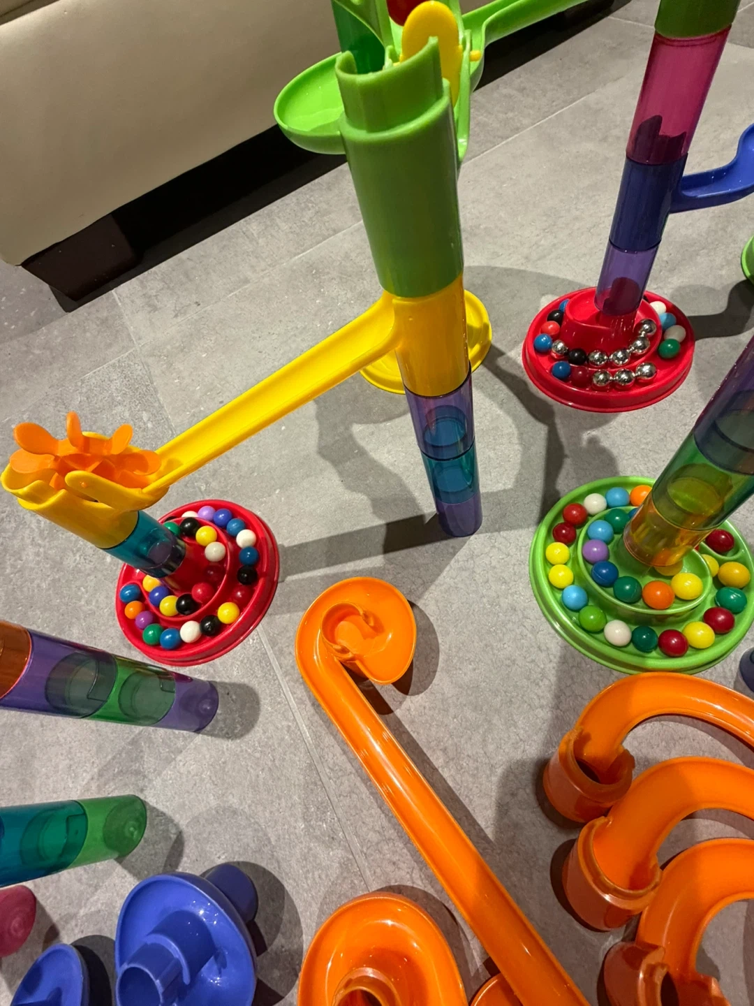 A colourful marble run set with various tubes, tracks, and bases. Includes many marbles for endless fun. It's a great way for kids to explore cause and effect and develop fine motor skills!