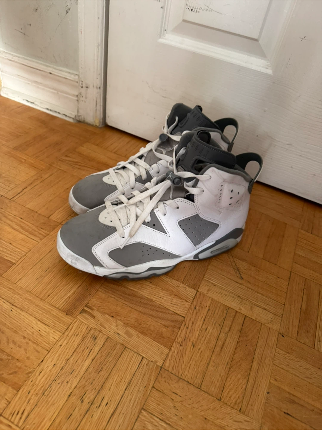Air Jordan 6 Retro "Cool Grey" sneakers. These kicks feature a crisp white and cool grey colourway. They're comfy and stylish, perfect for everyday wear.