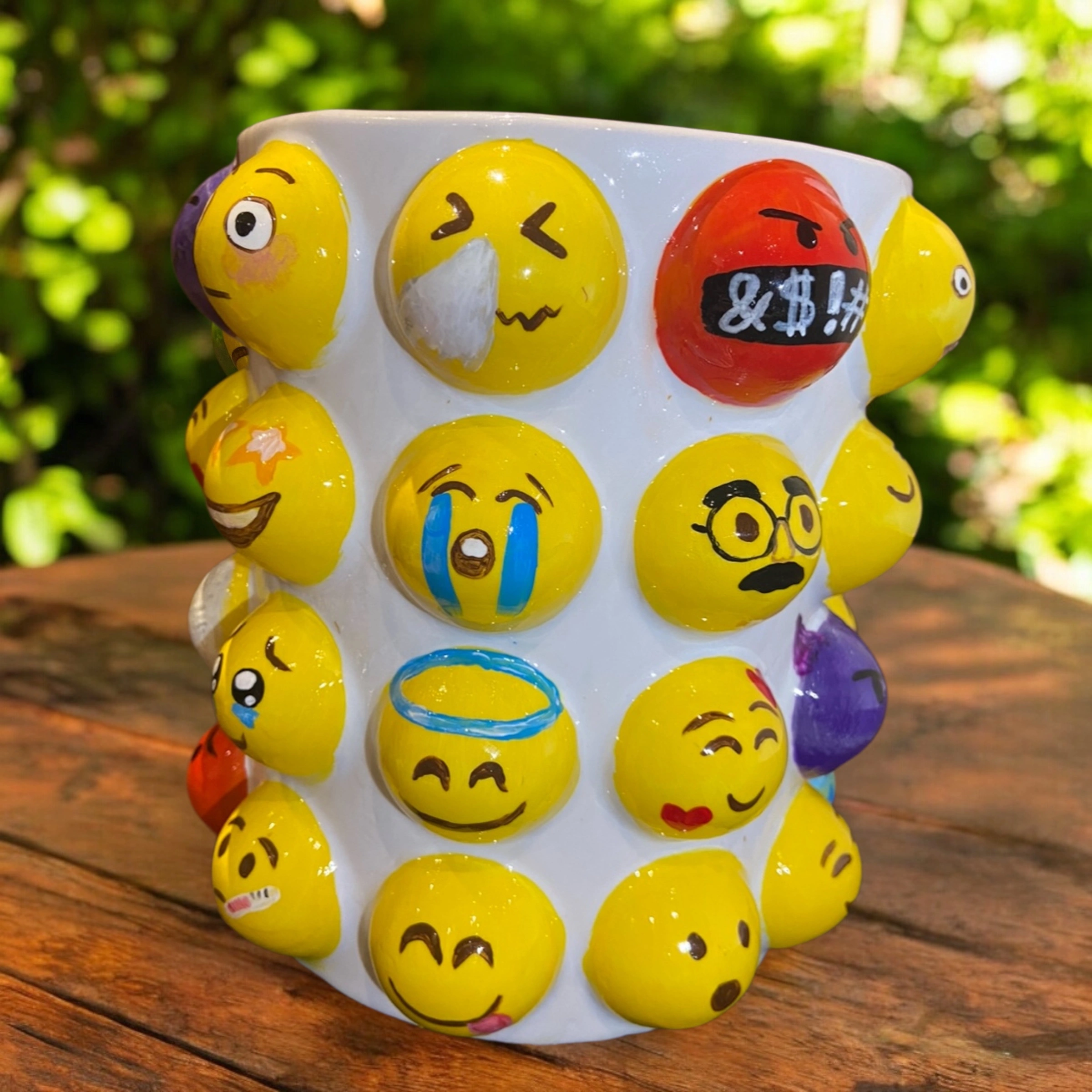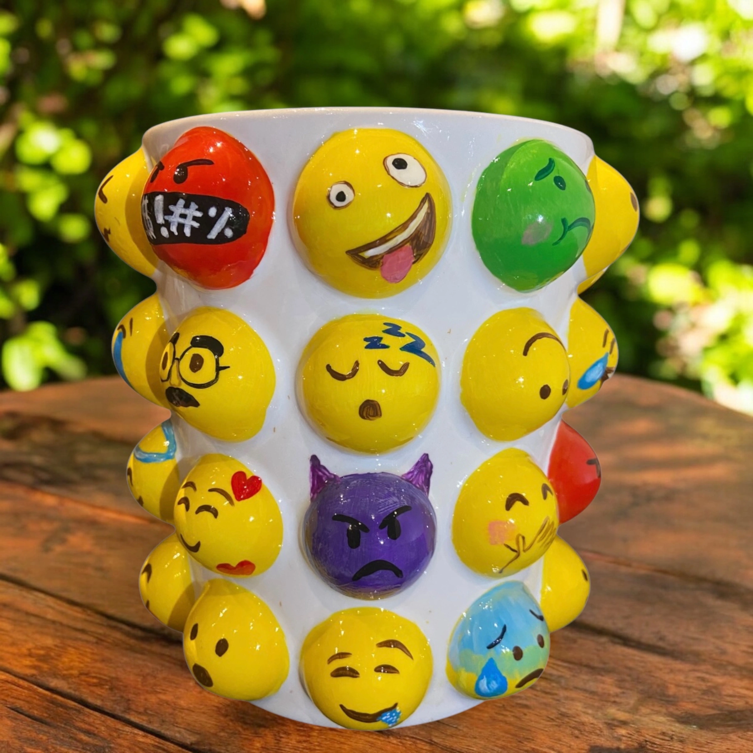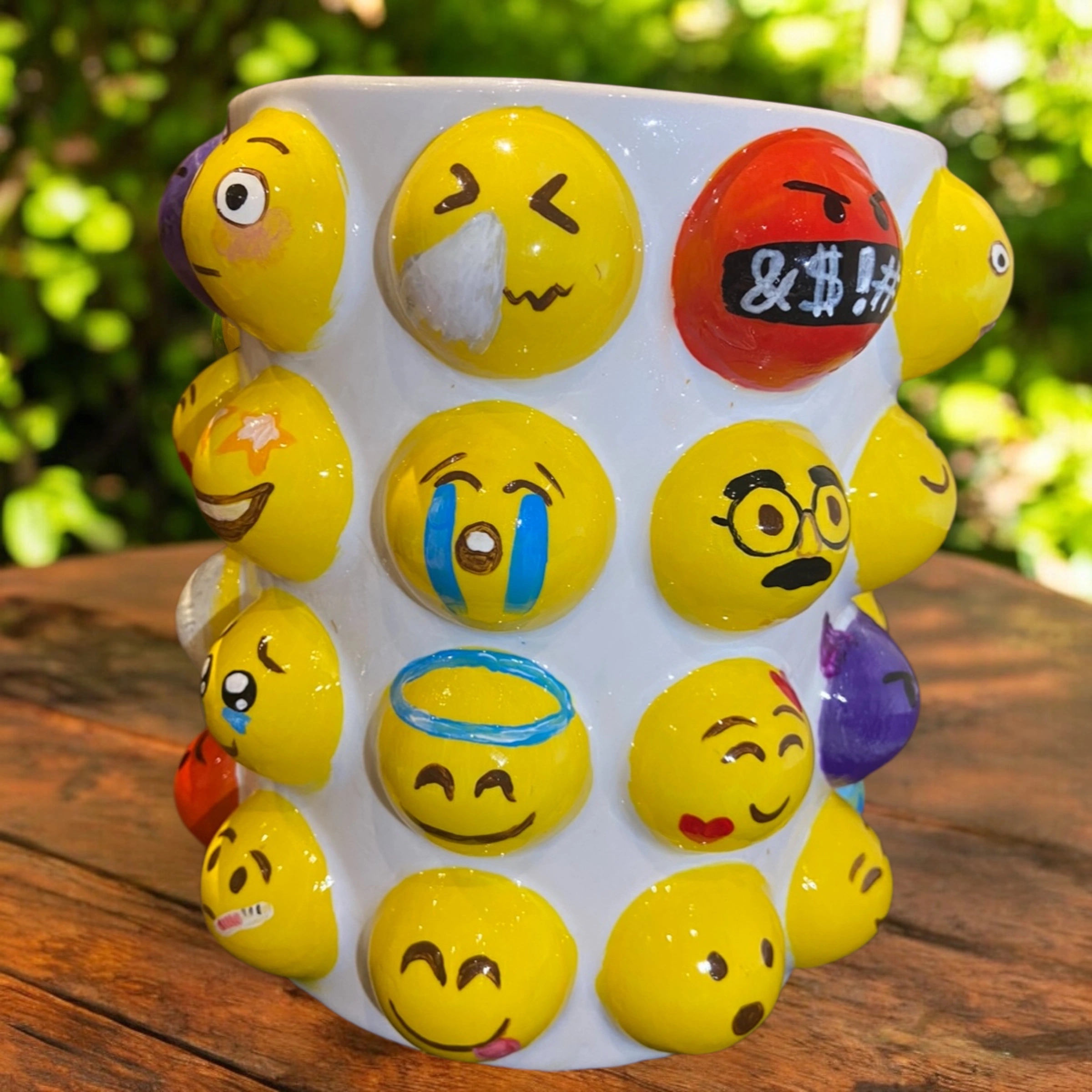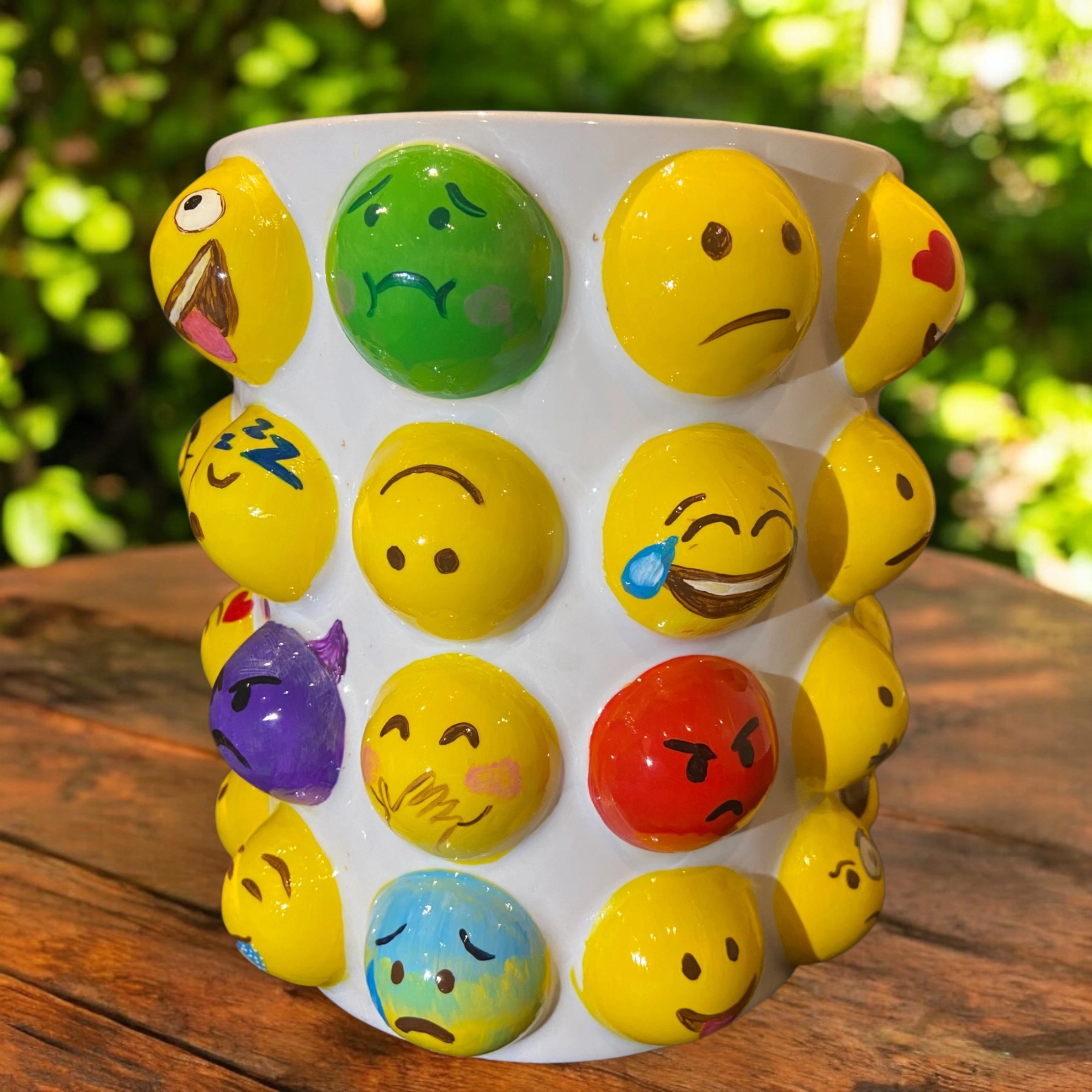 This is a handmade mug with various emoji faces on it! It's a unique and fun piece for your kitchen or office