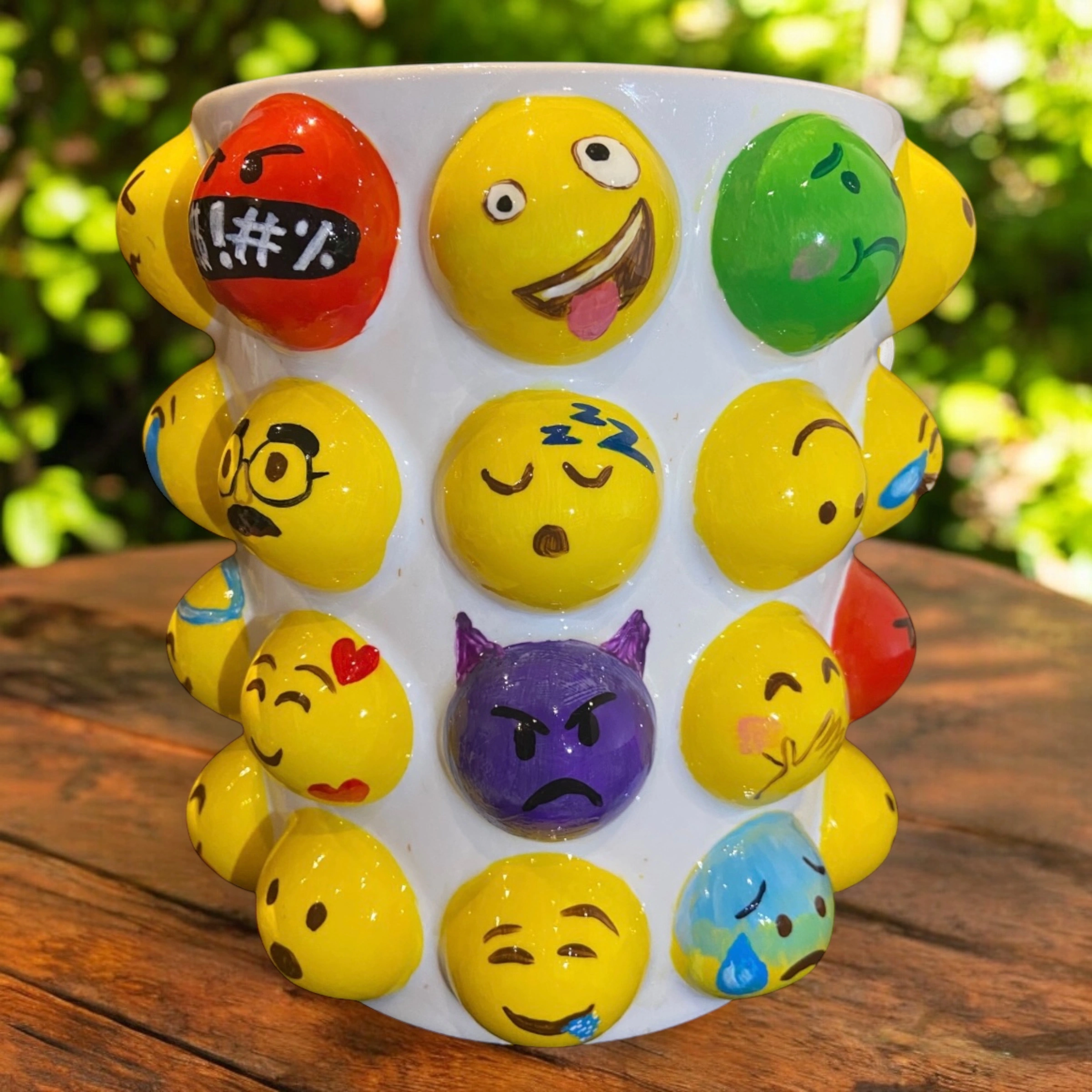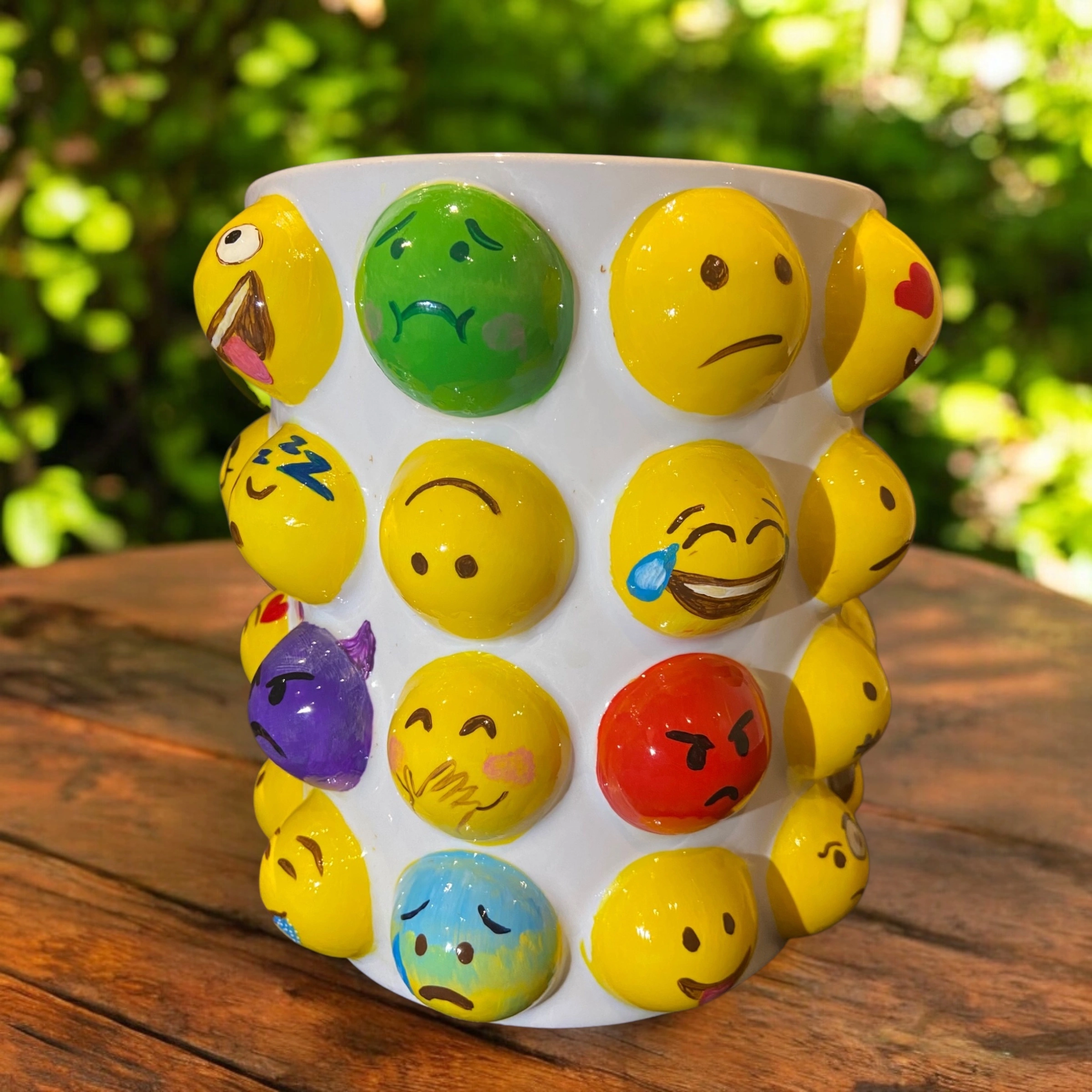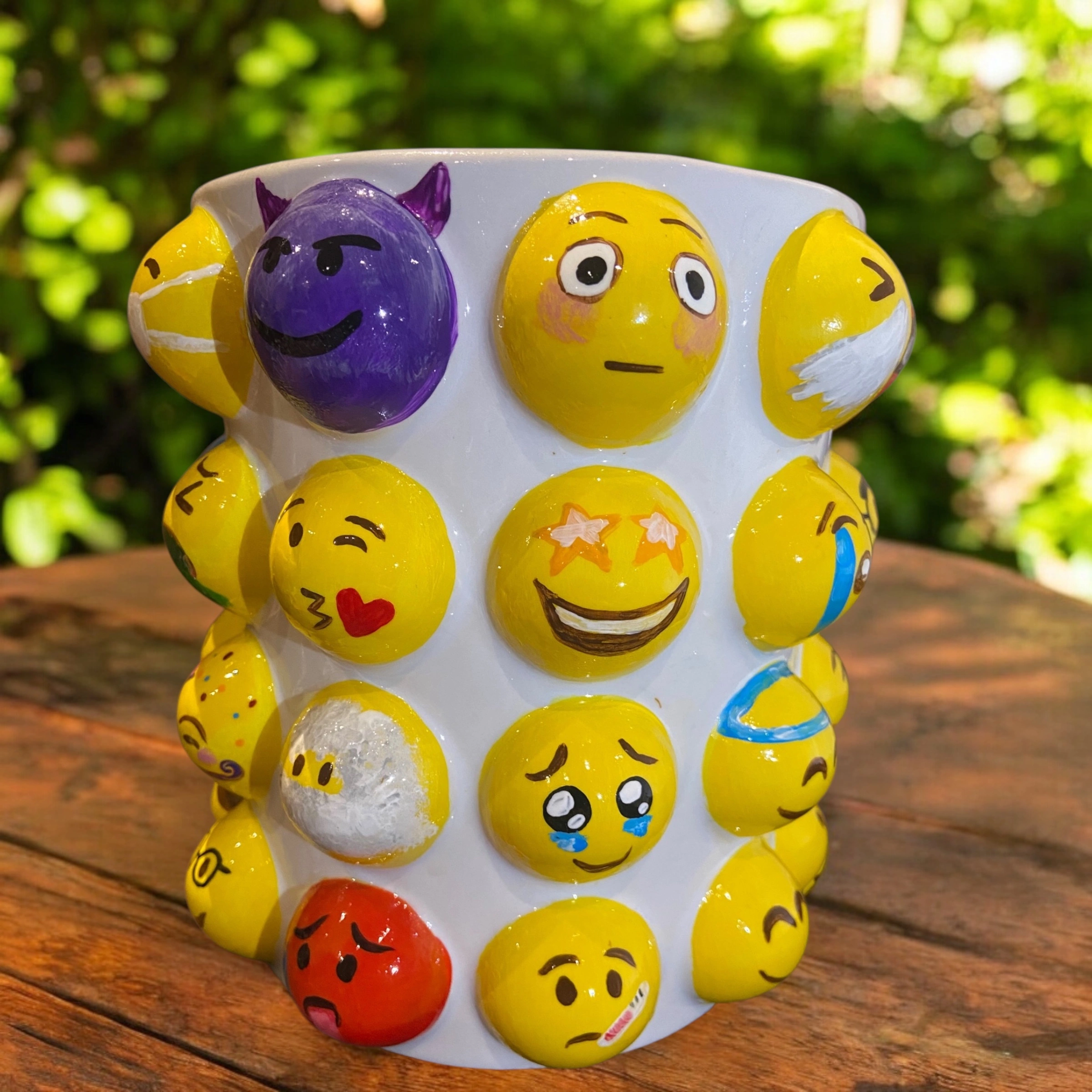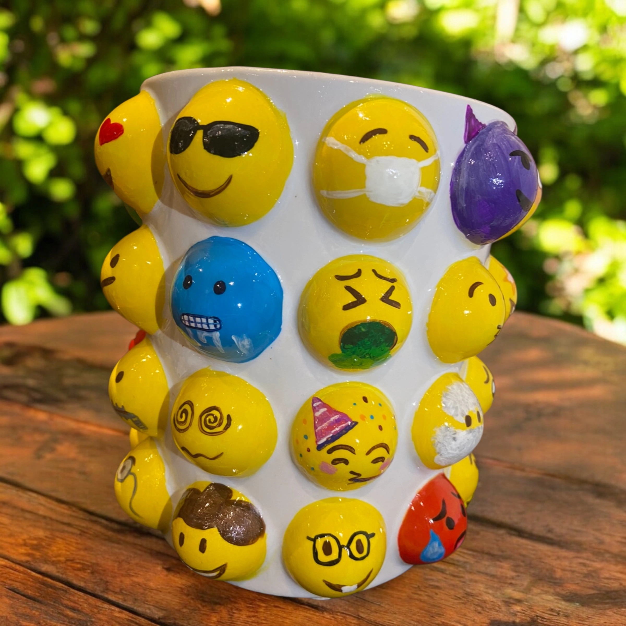This is a handmade mug with various emoji faces on it! It's a unique and fun piece for your kitchen or office