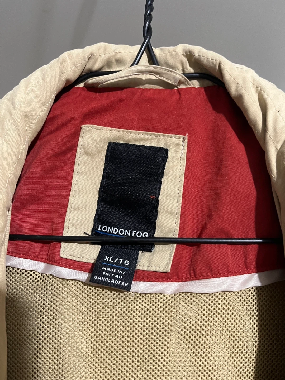 Here's a London Fog jacket in size XL. It's a beige colour with a red and white striped lining. Perfect for spring or fall!