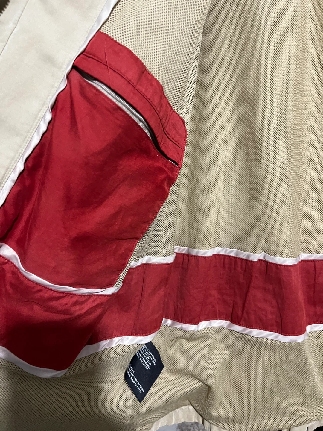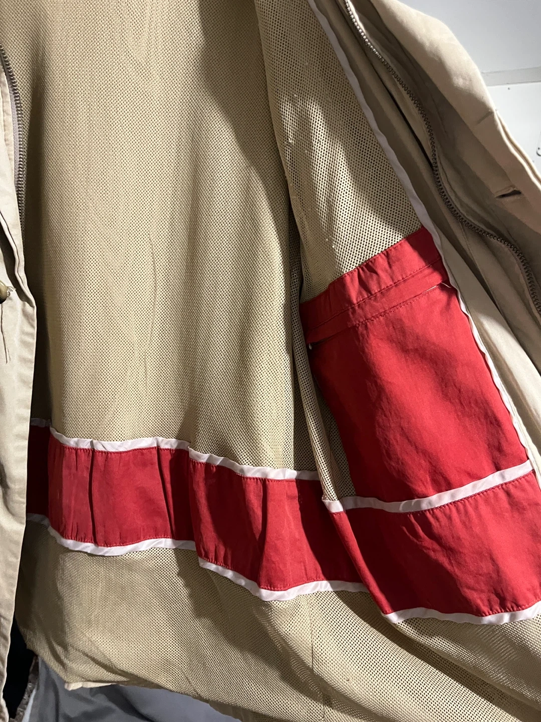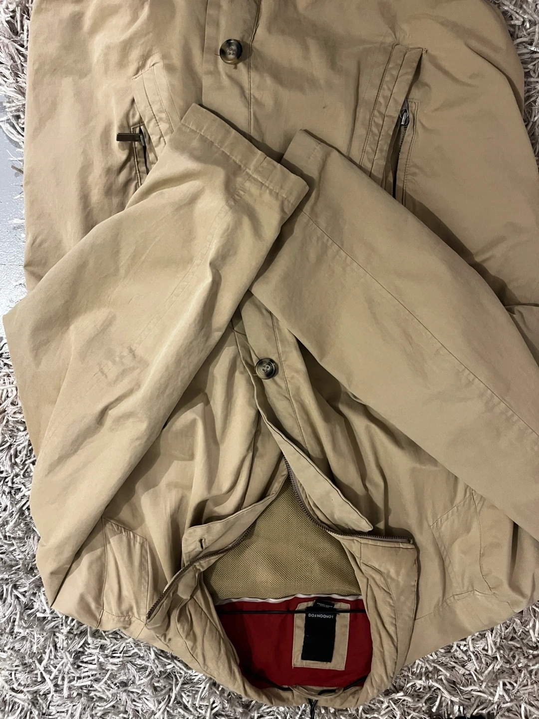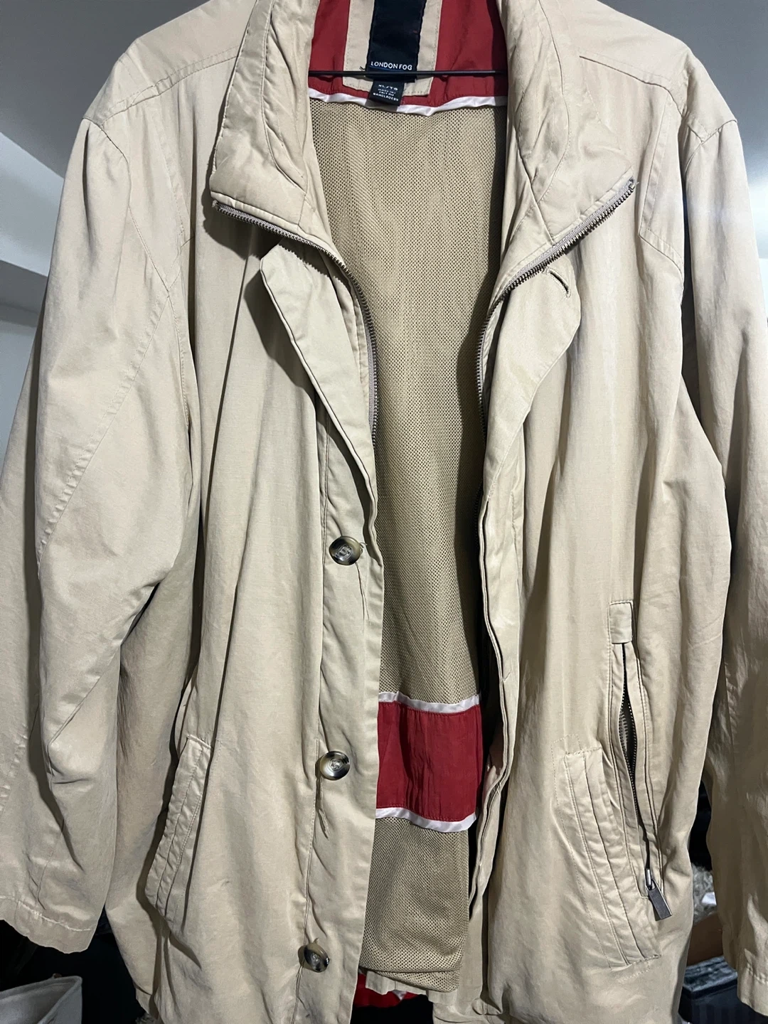 Here's a London Fog jacket in size XL. It's a beige colour with a red and white striped lining. Perfect for spring or fall!