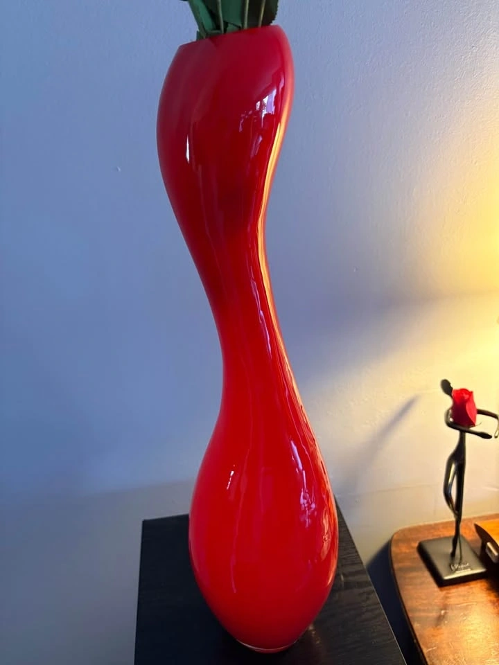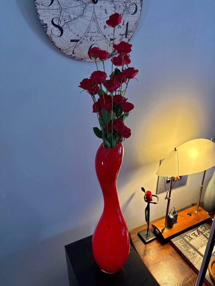 Distinctive red, faux roses are included. Approximately 19.5 inches tall. An inexpensive addition to your home decor. Pickup only in Burlington. (Pinedale Ave) Price is firm. Thank you.