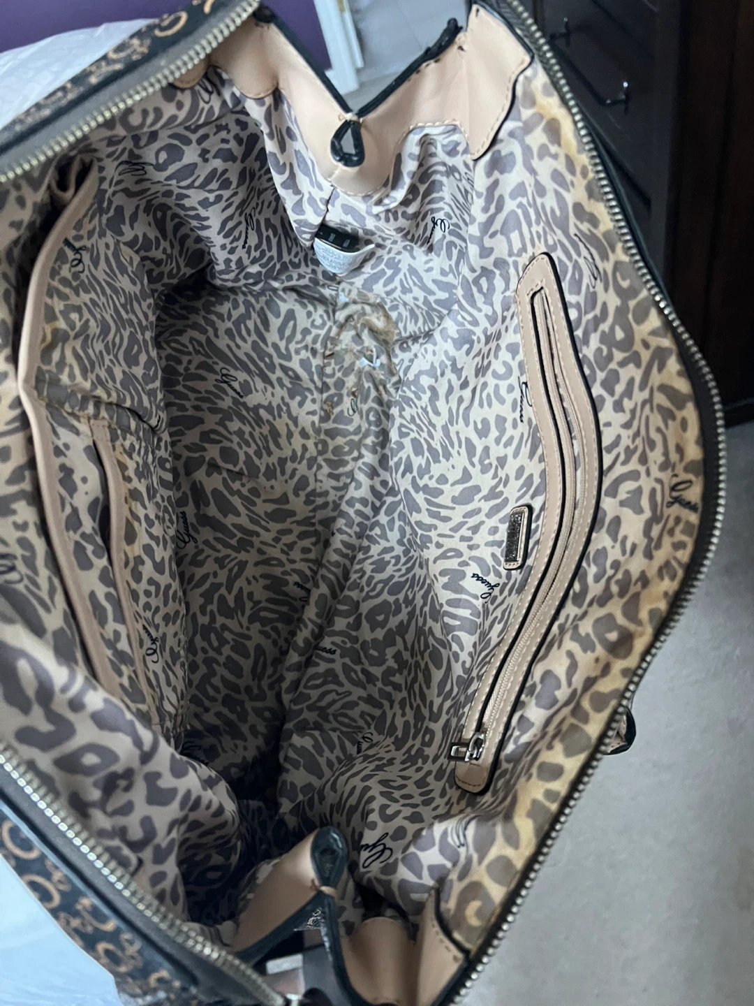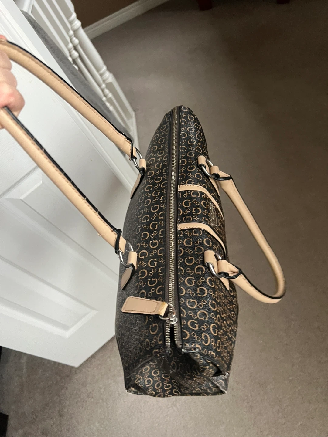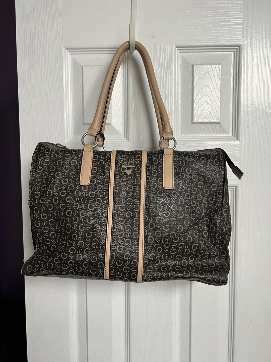 This Guess tote bag features a classic monogram pattern. It has dual top handles and a zip closure for security. Some wear is visible on the handle edges.