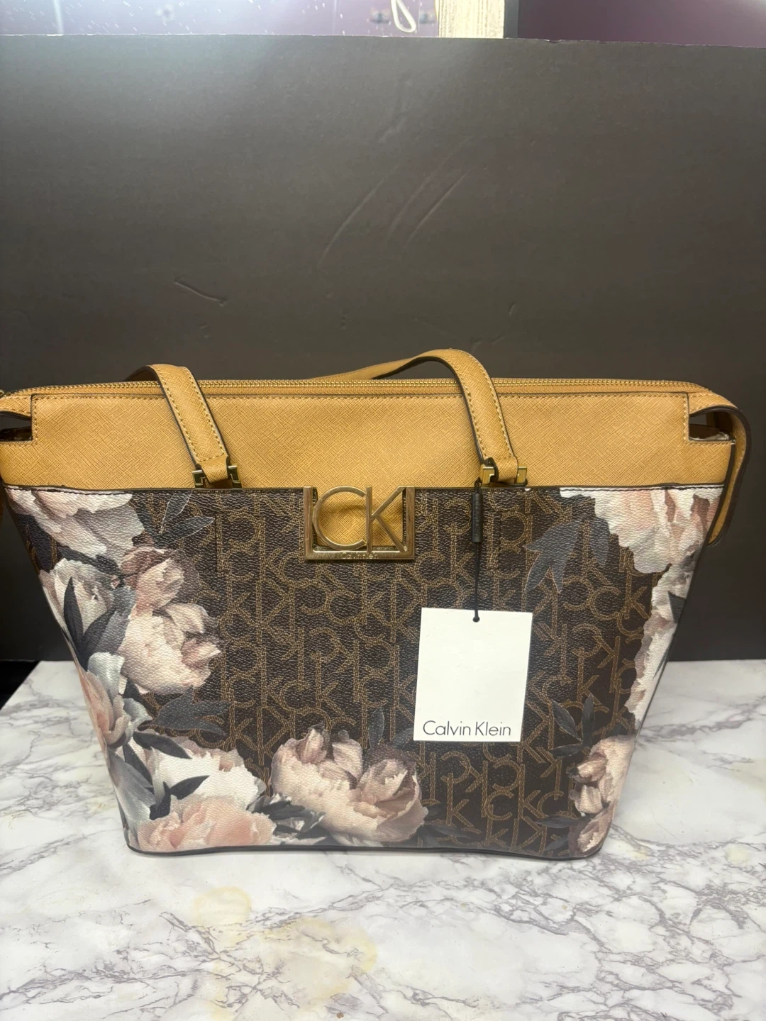 This is a Calvin Klein tote bag with a beautiful floral pattern. It features the CK logo and tan handles. Perfect for everyday use!