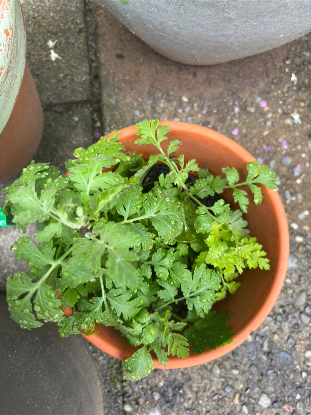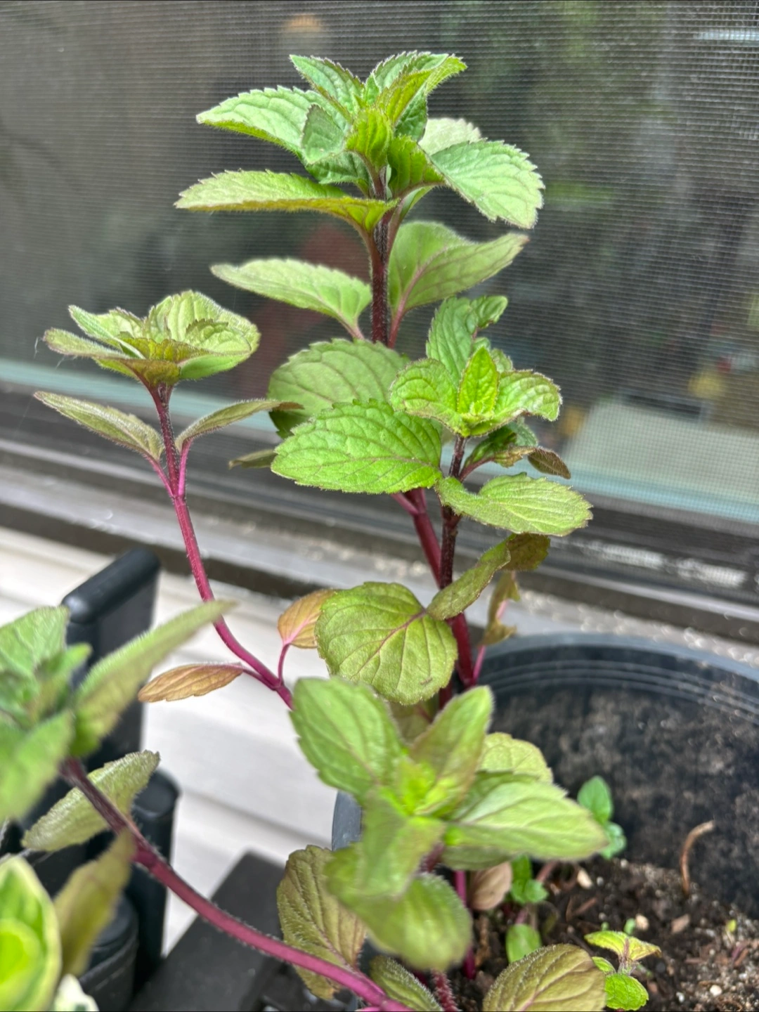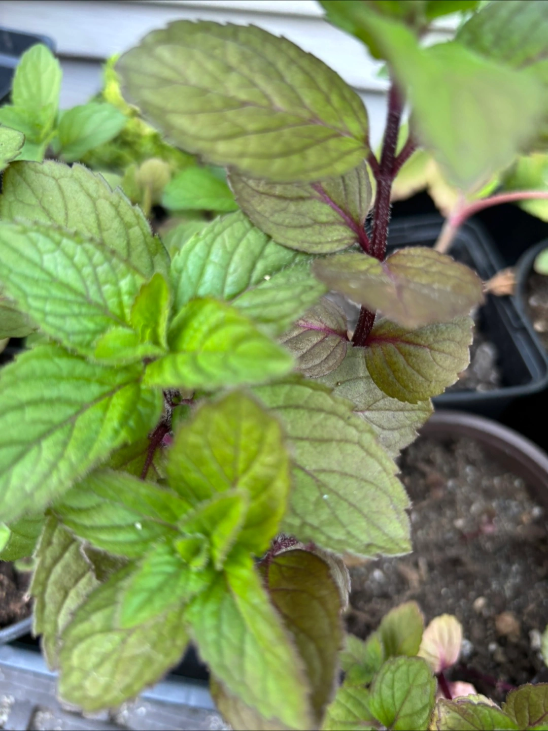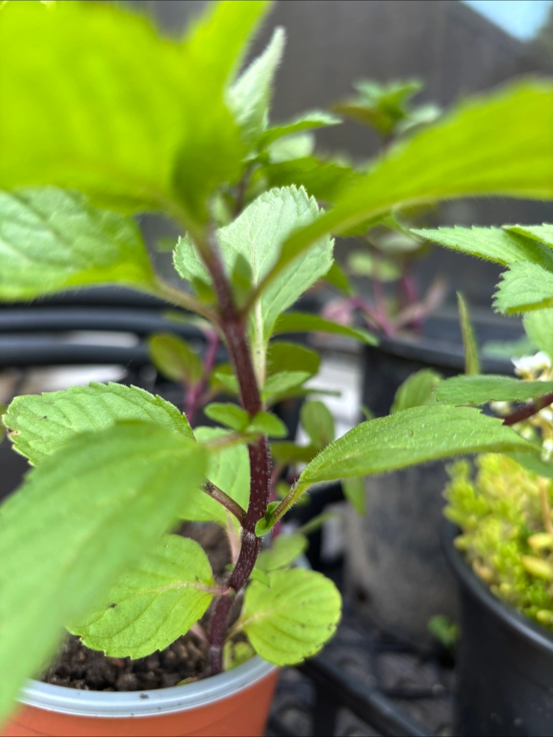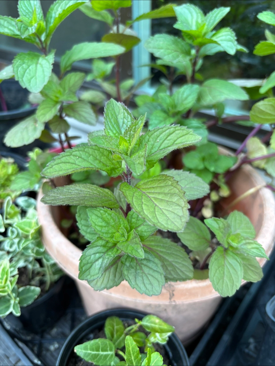 6 potted plants, mint with dark stems and vibrant leaves. 3 other pots with feverfew. This mint has such a great aroma. The feverfew is about to bloom.