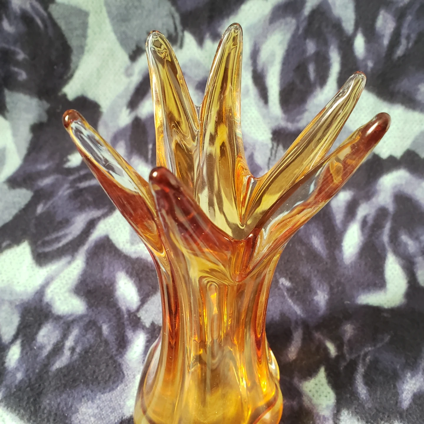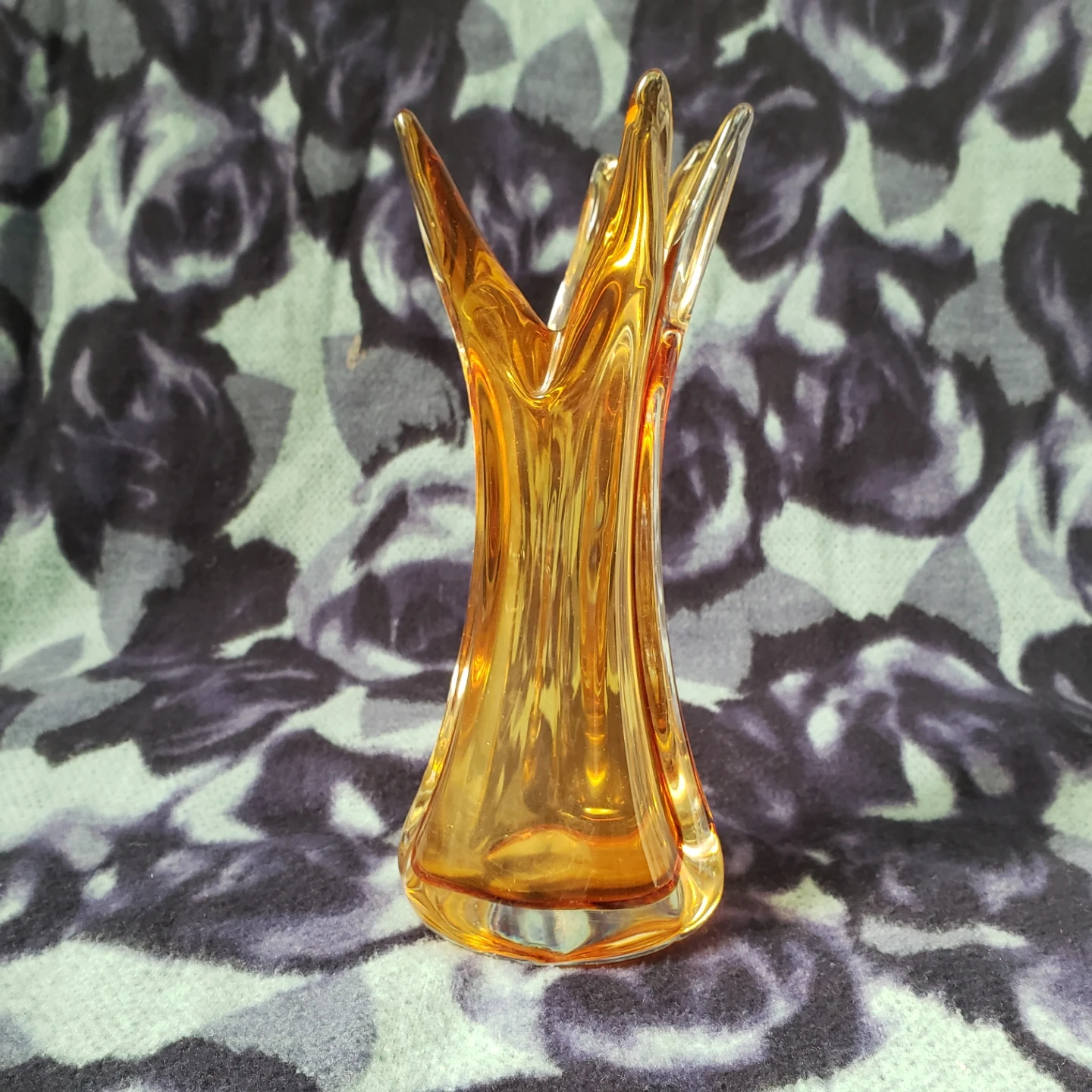 This is an amber glass vase with a unique swirl design. It's perfect for small bouquets or as a decorative accent piece. Glass material. Murano like style. 8.5" tall