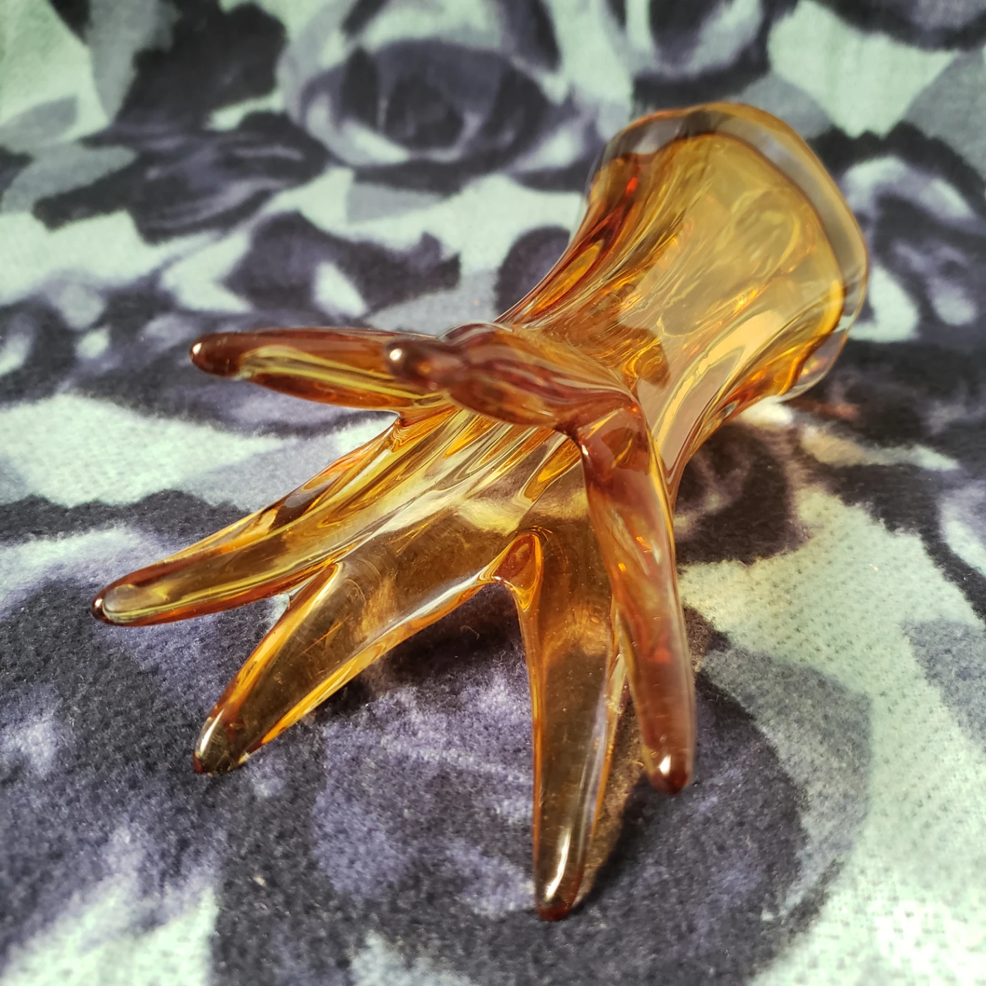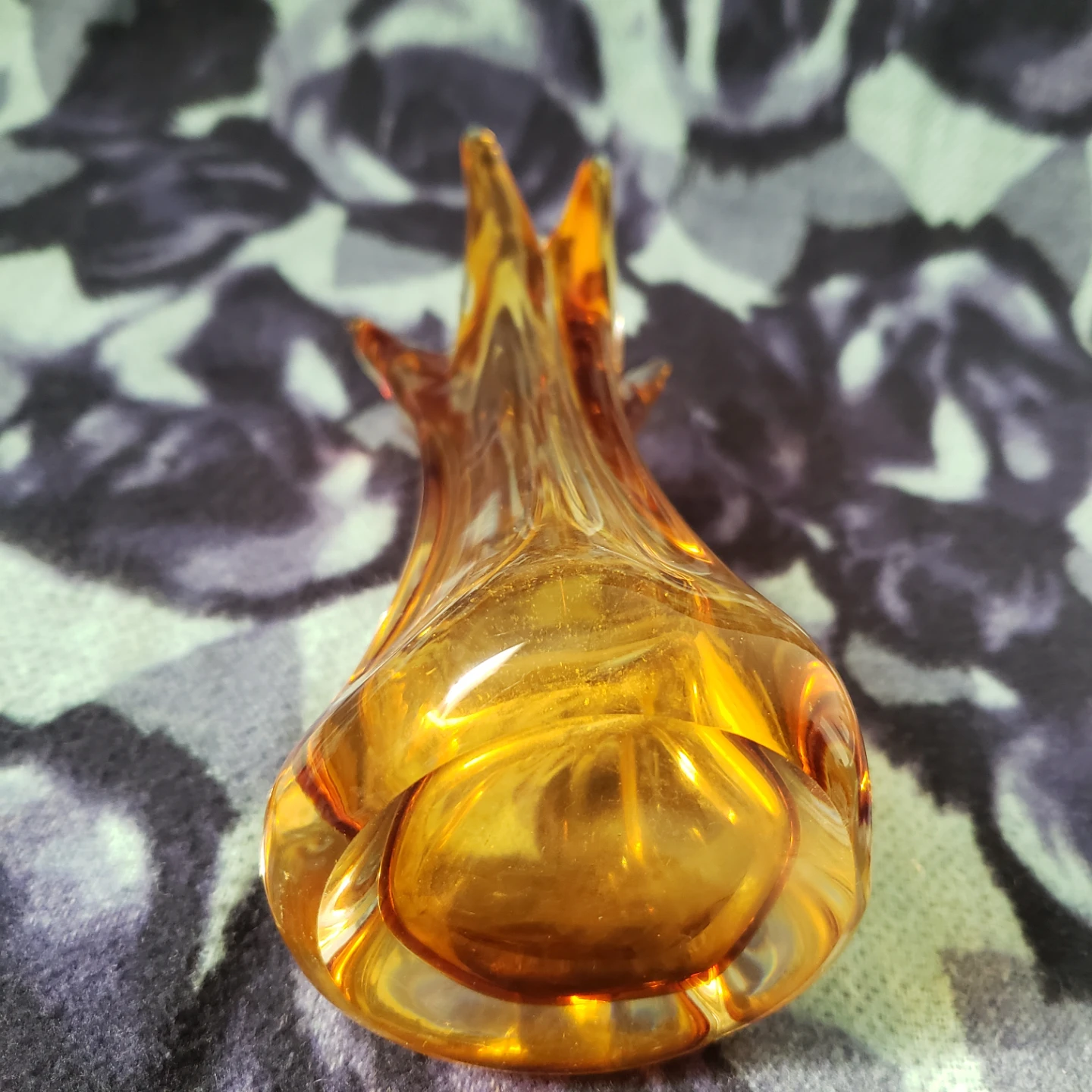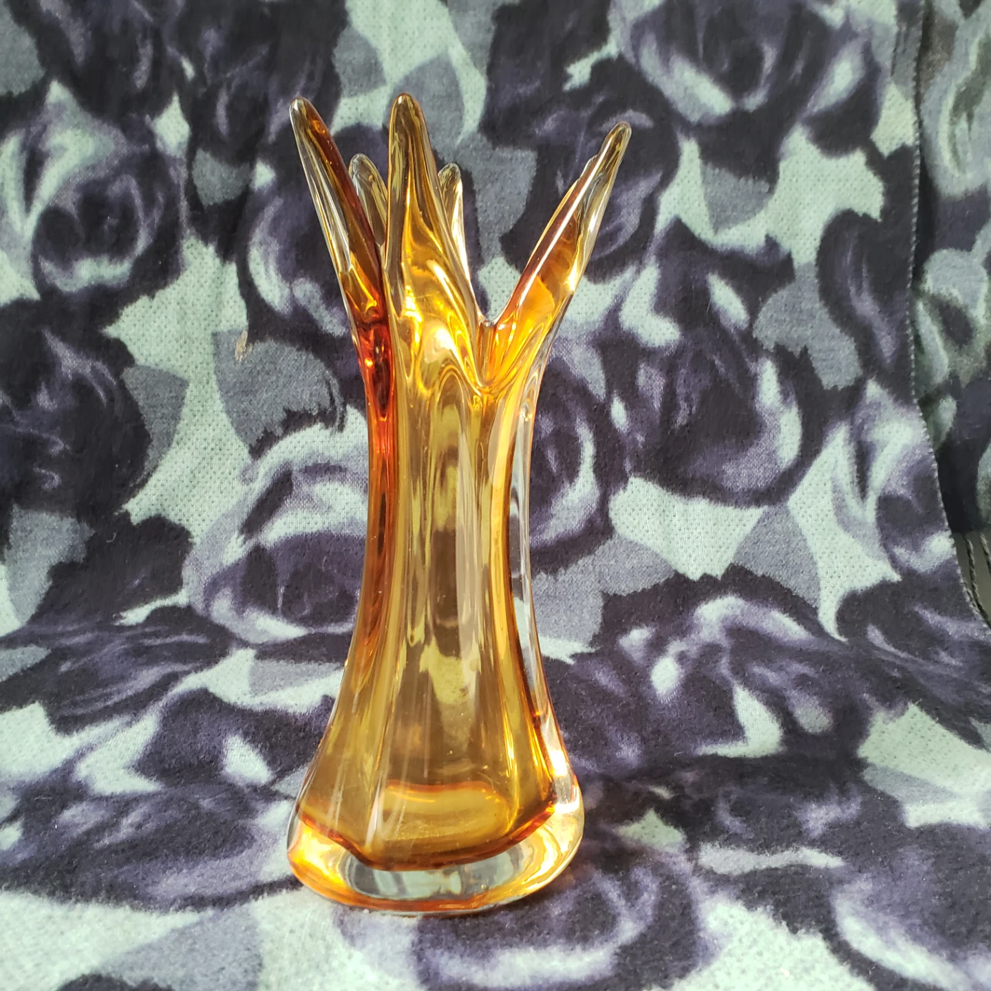 This is an amber glass vase with a unique swirl design. It's perfect for small bouquets or as a decorative accent piece. Glass material. Murano like style. 8.5" tall