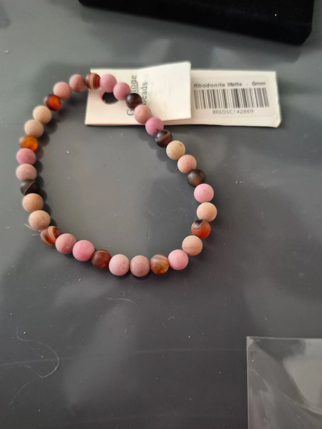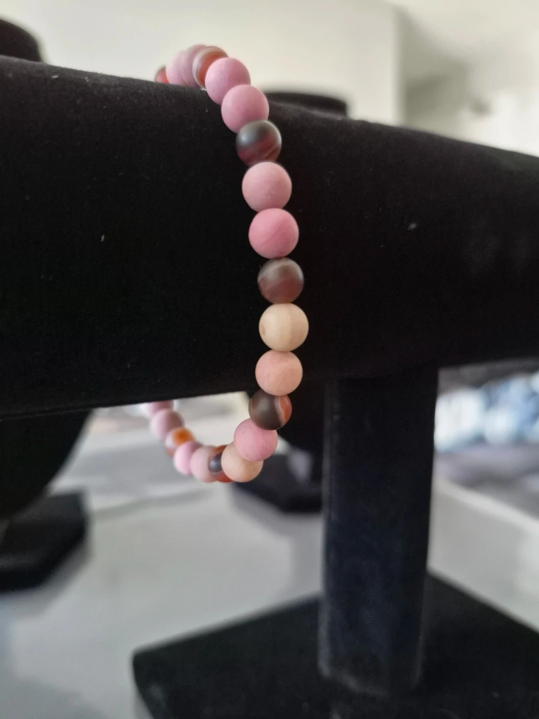 This stretchy bracelet features matte rhodonite beads. The beads are 6mm in size and have a beautiful mix of pink and brown tones. It's a lovely accessory for everyday wear!