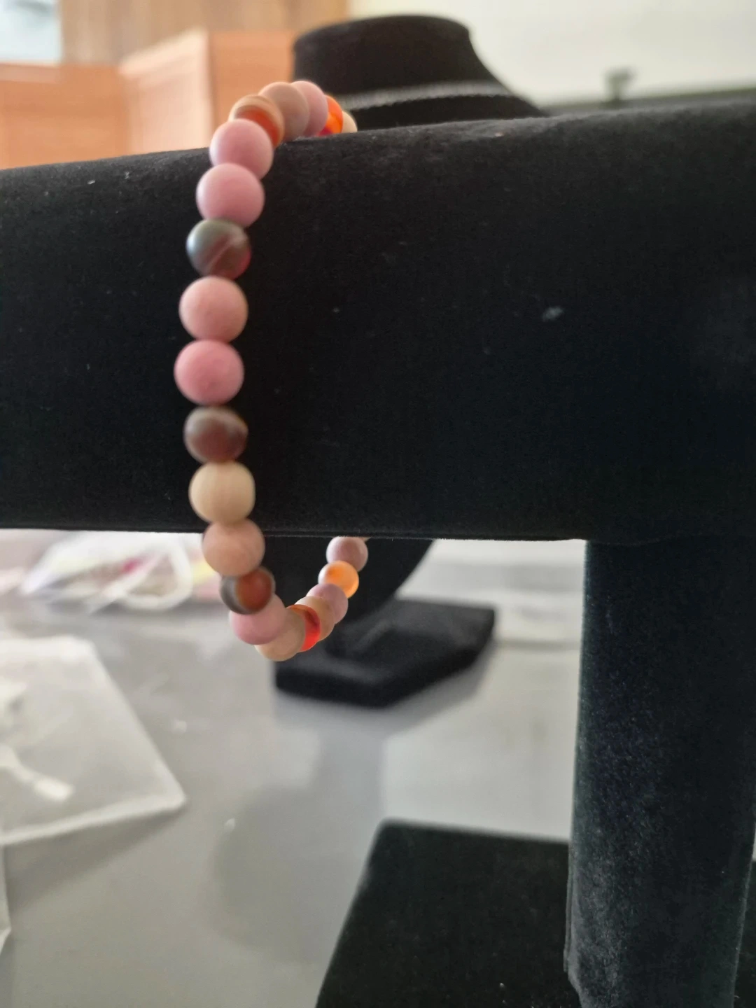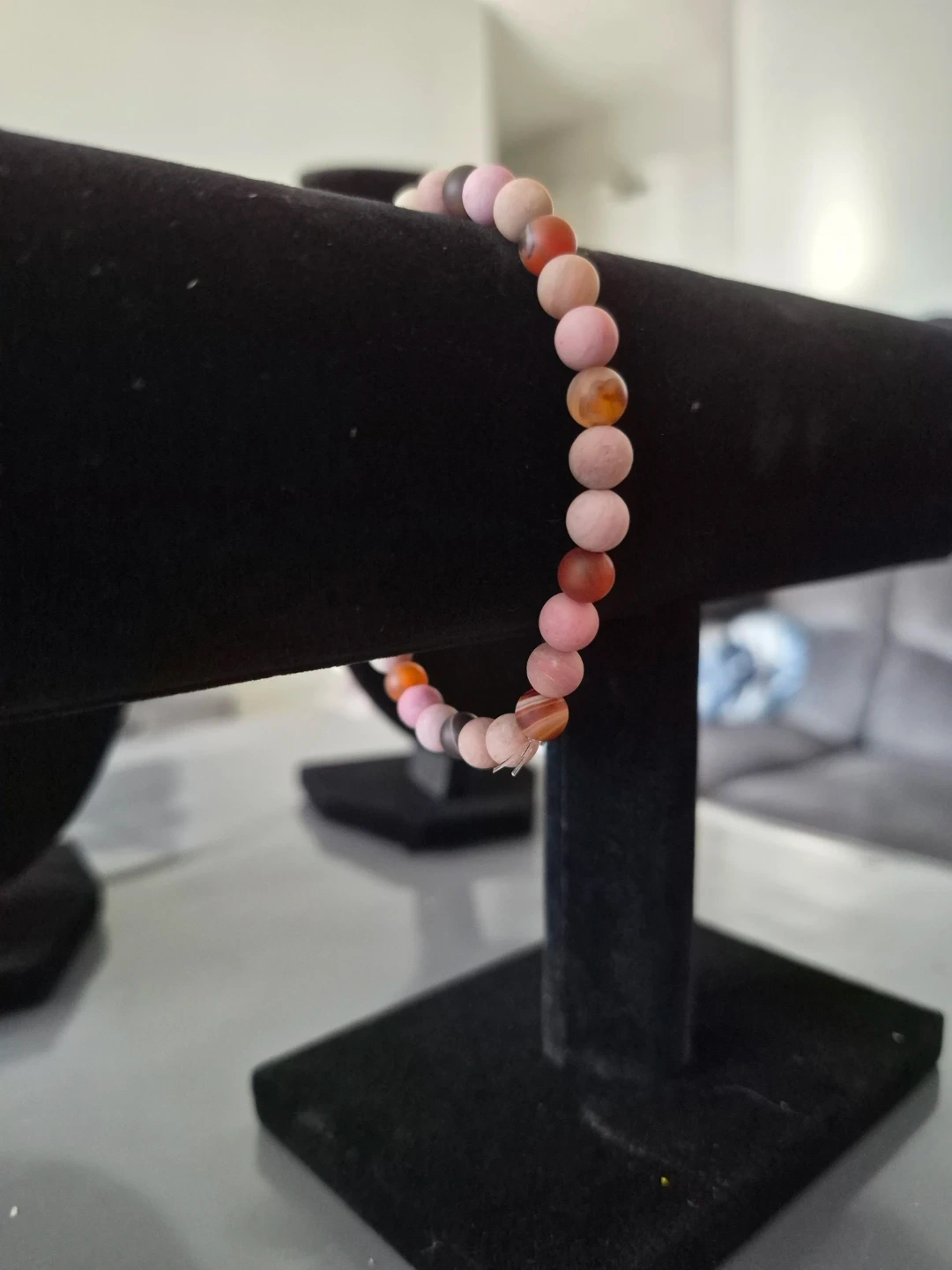 This stretchy bracelet features matte rhodonite beads. The beads are 6mm in size and have a beautiful mix of pink and brown tones. It's a lovely accessory for everyday wear!