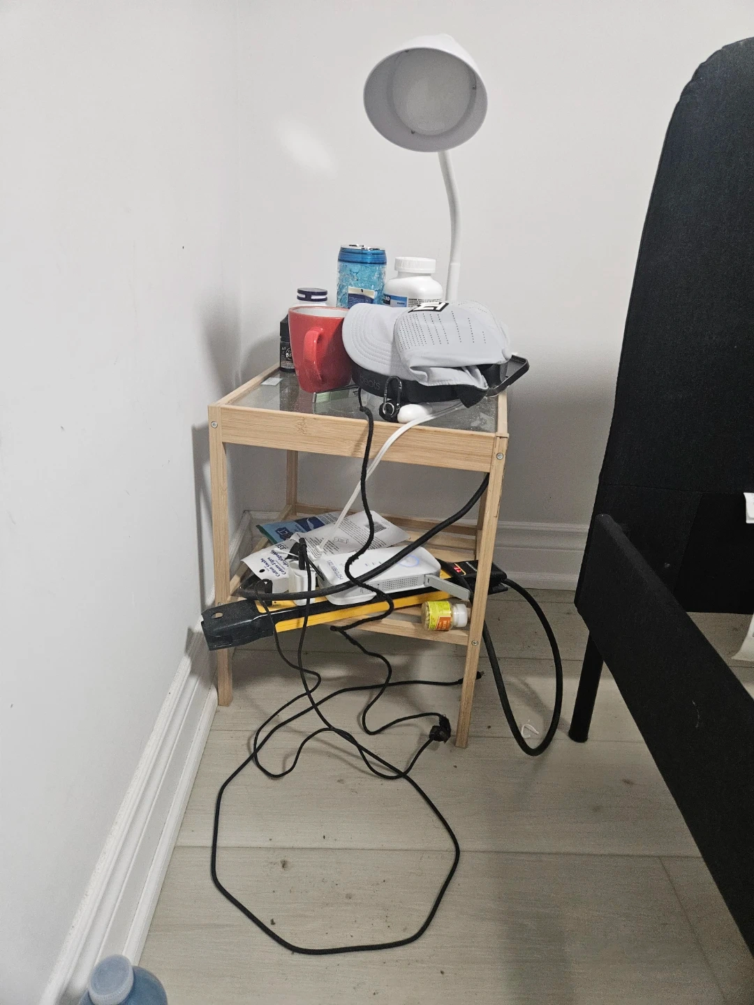 A simple IKEA nightstand . It's made of wood and glass. Perfect for a bedside table setup. It's handy for holding essentials like mugs, medications, or books.