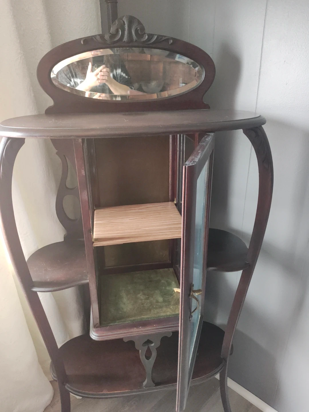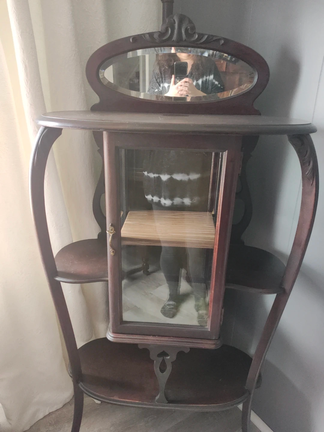 Beautiful antique wooden display cabinet with glass doors and shelves. Features an oval mirror at the top and decorative carvings. Perfect for showcasing collectibles items!