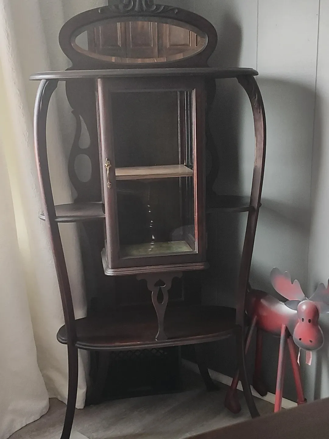 Beautiful antique wooden display cabinet with glass doors and shelves. Features an oval mirror at the top and decorative carvings. Perfect for showcasing collectibles items!