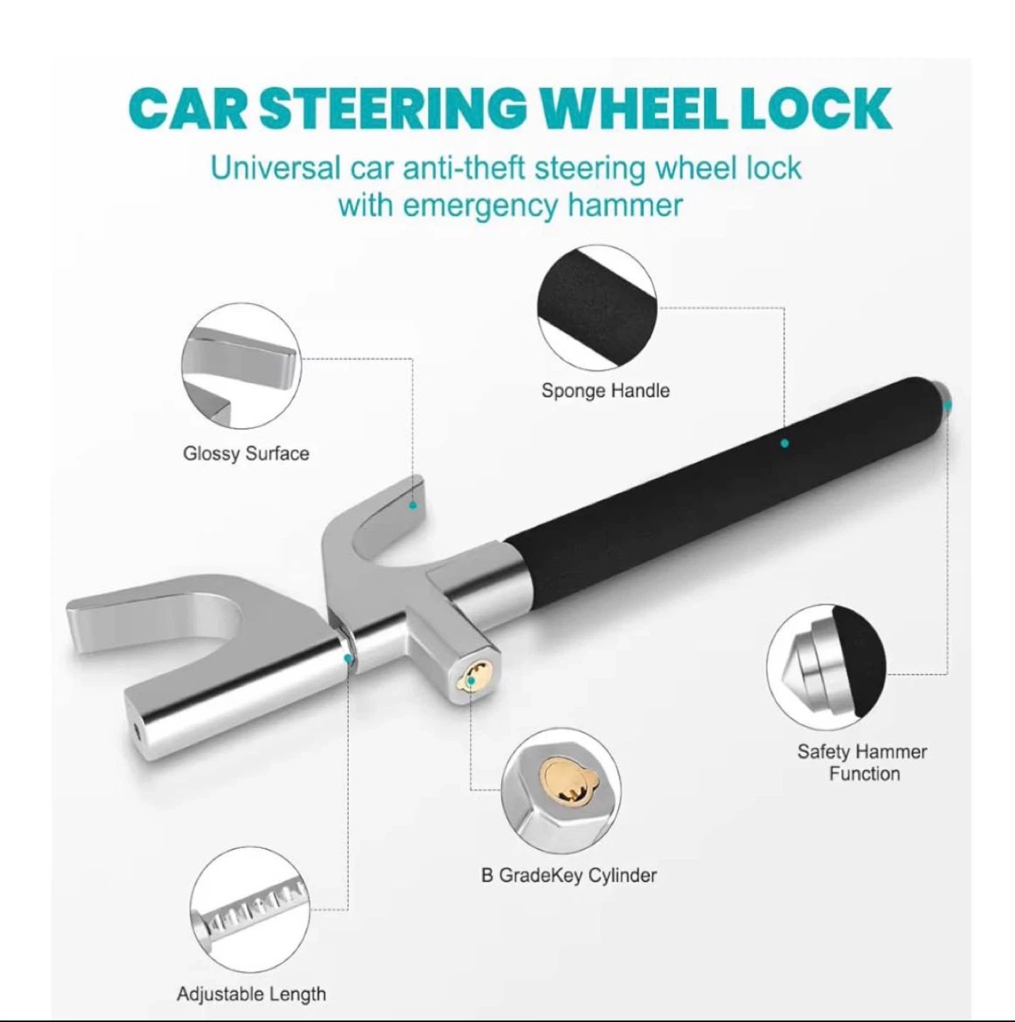 Universal car anti-theft steering wheel lock. It features a glossy surface and a sponge handle for comfortable grip. The lock has an adjustable length and includes a B-Grade key cylinder. It also has a safety hammer function for emergencies.