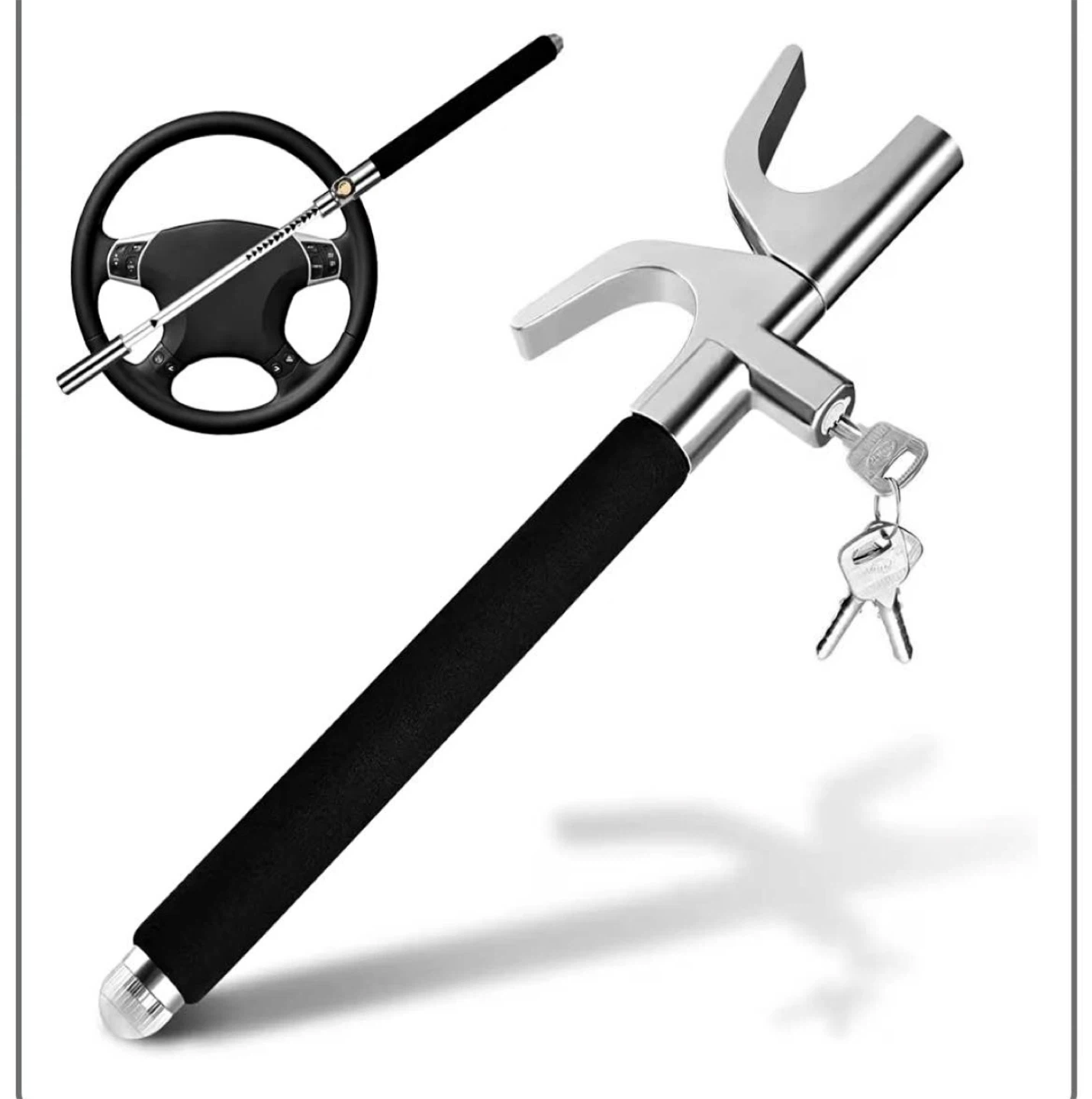 Universal car anti-theft steering wheel lock. It features a glossy surface and a sponge handle for comfortable grip. The lock has an adjustable length and includes a B-Grade key cylinder. It also has a safety hammer function for emergencies.