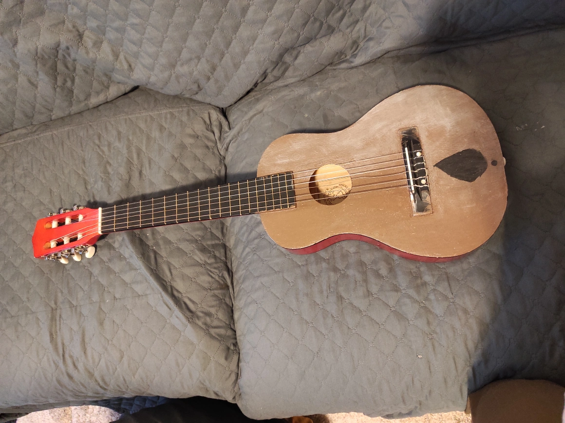 this toy guitar that is made for kids. It works perfectly and is very fun to play with.some spots of paint on guitar.