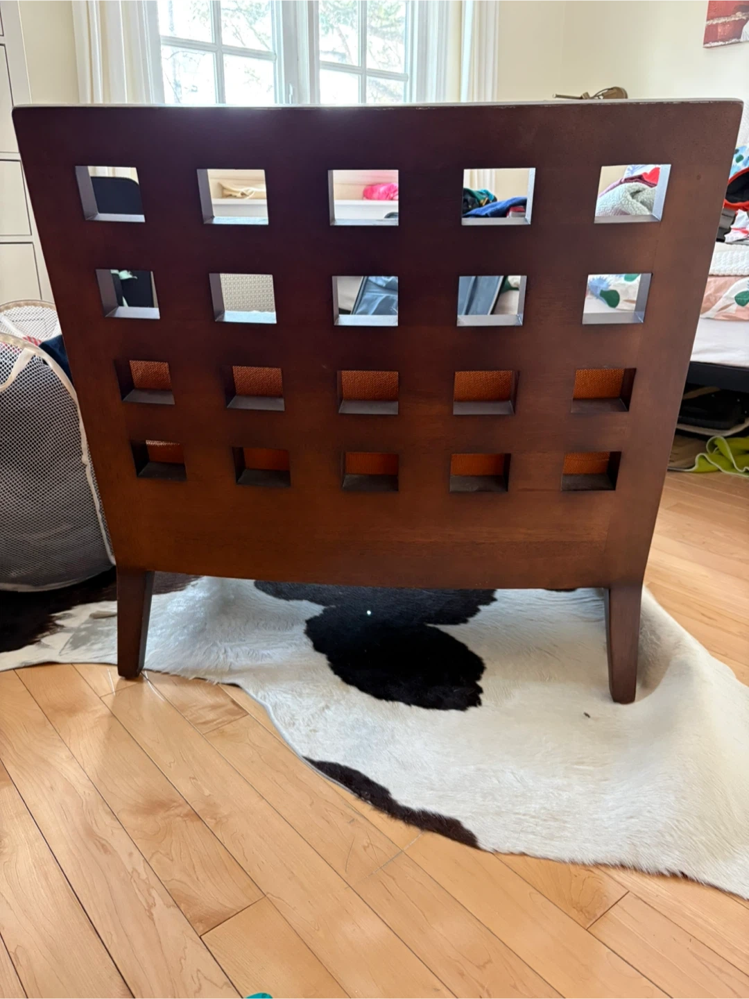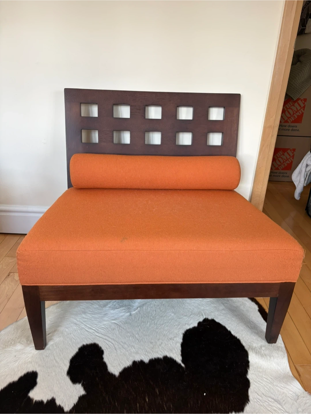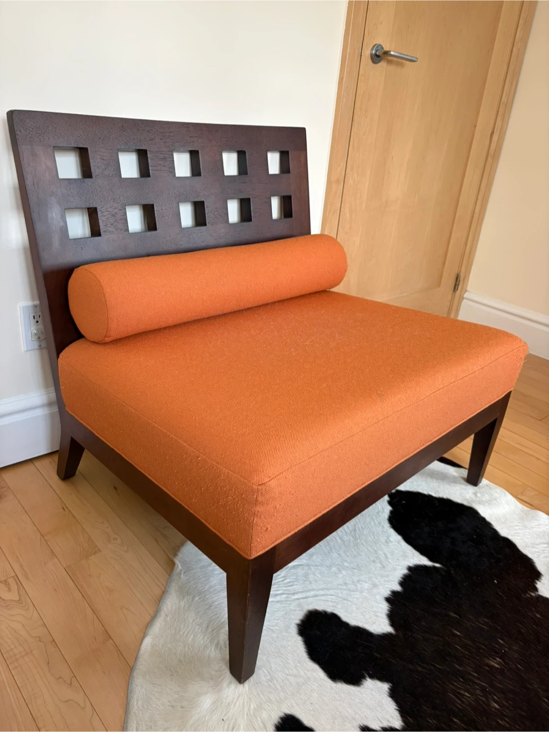 Accent chair featuring dark solid wood frame and vibrant orange fabric upholstery. It includes a removable cylindrical bolster pillow for added comfort. The backrest has a stylish open square pattern. It’s definitely been slept on by my cat, as well as a little scratched on the fabric corners. Still in great shape, and would be magnificent for re-upholstering!