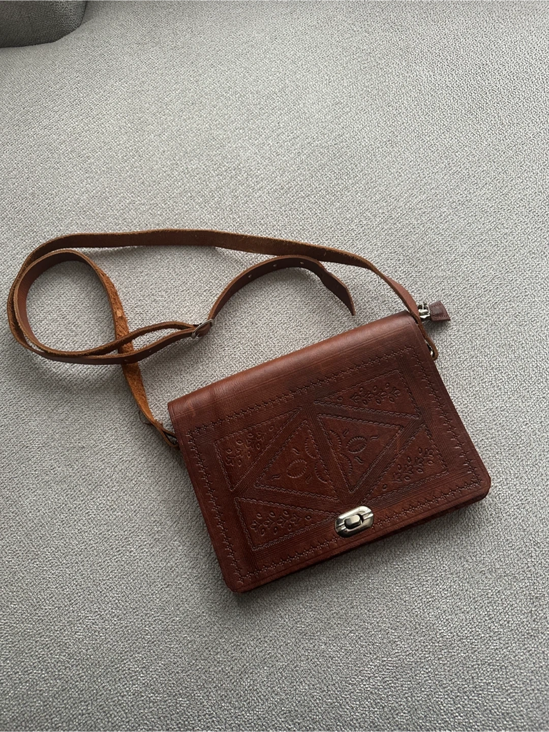 This is a brown leather shoulder bag with a decorative embossed pattern. It features a metal clasp closure and an adjustable leather strap. The interior is lined and has a small compartment.
