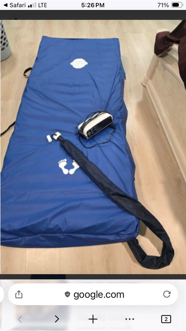 For sale is a lightly used Vive low-air-loss pressure air mattress with a highly customizable digital pump. This active-mattress replacement system provides alternating pressure and low air loss to optimize pressure redistribution, shear/friction reduction, and microclimate control. It's for home use. The 18 individual air bladders can be adjusted for desired firmness or softness via the pump. Dimensions are 36"x 80" with an 8" height. An electric adjustable bed (with side rails) is also available for an extra $300, and a hospital bed table for an extra $50. Cash and cashless payments are accepted.