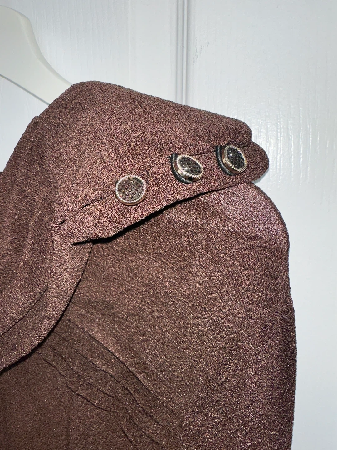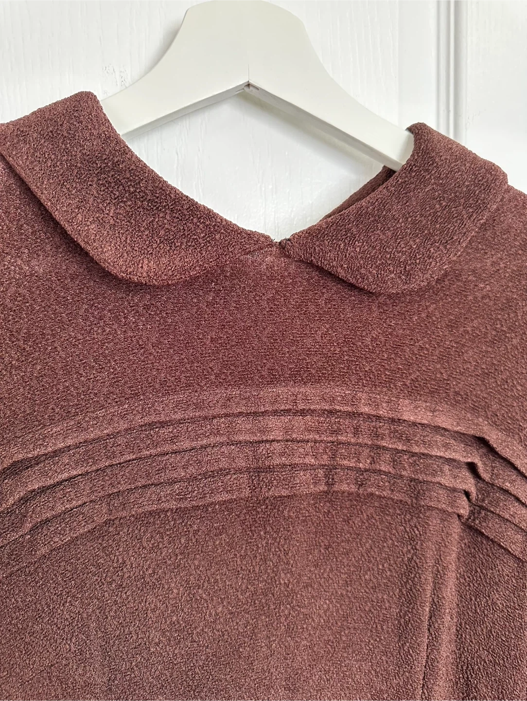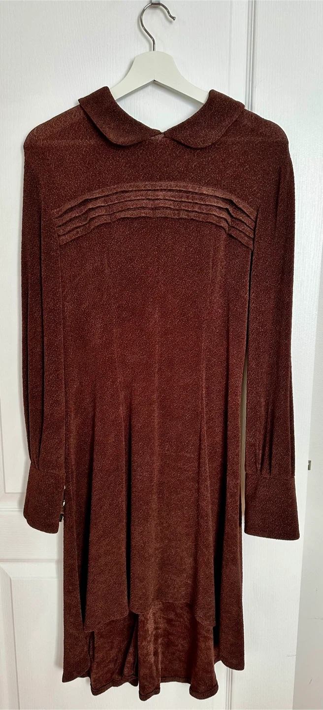 This hand sewn, brown long-sleeve dress features a classic Peter Pan collar and elegant pleating detail on the bodice. It has decorative buttons on the cuffs and a flowing, layered hemline. The fabric has a subtle metallic sheen, making it a lovely choice for many occasions.
