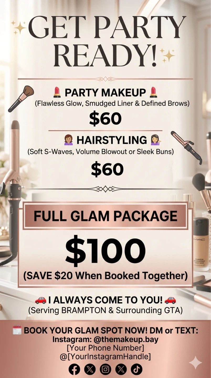Get party ready with professional makeup and hairstyling services. Choose from party makeup for a flawless glow, or hairstyling for soft s-waves, a volume blowout, or sleek buns. A full glam package is also available, saving you $20 when booked together. Services are mobile and available in Brampton and surrounding GTA. Travel charges according to location.