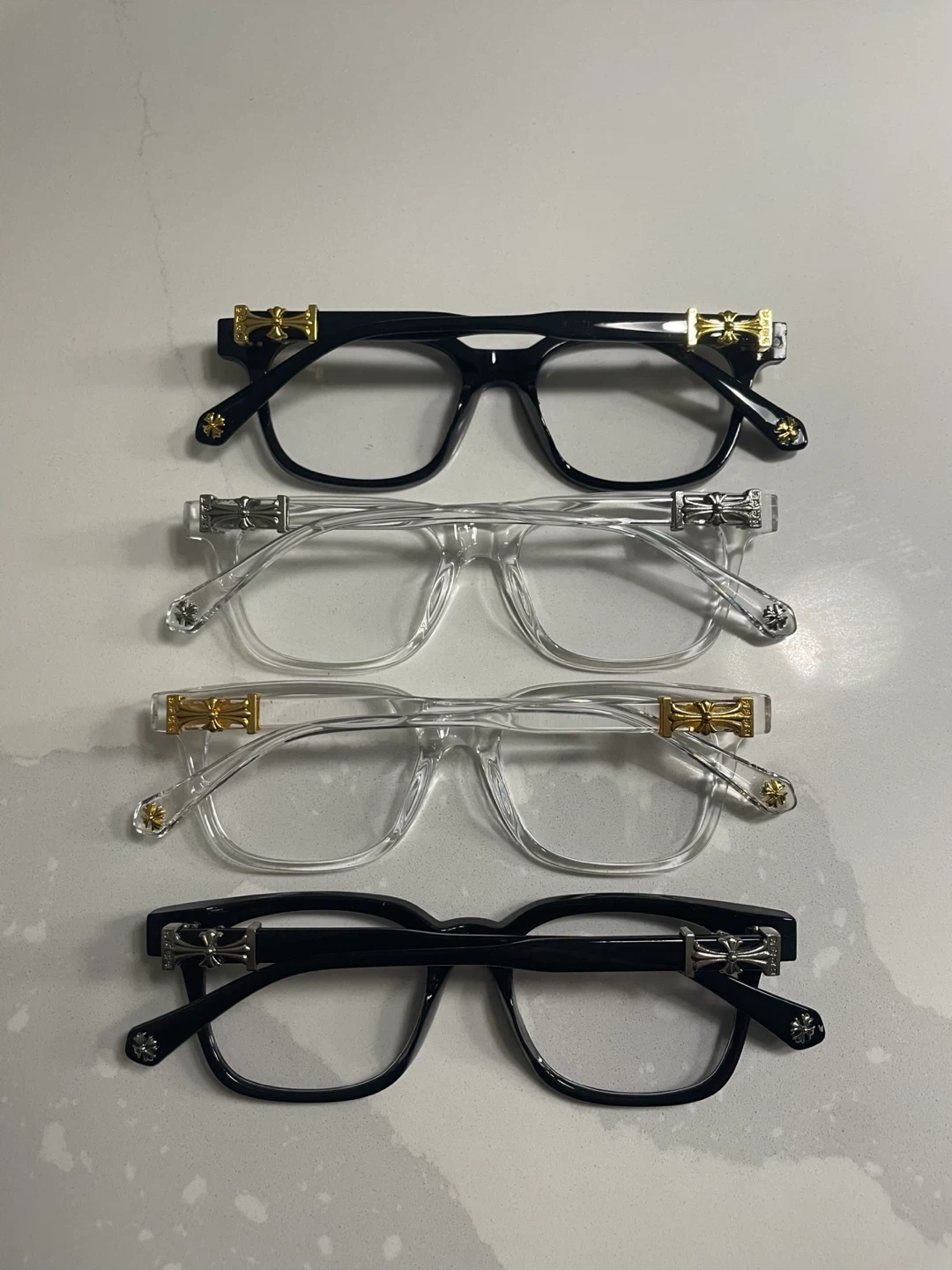 Set of four eyeglasses frames with gold accents. Two black frames and two clear frames. These frames have the distinctive Chrome Hearts cross detail. Perfect for someone looking to customize their own lenses!