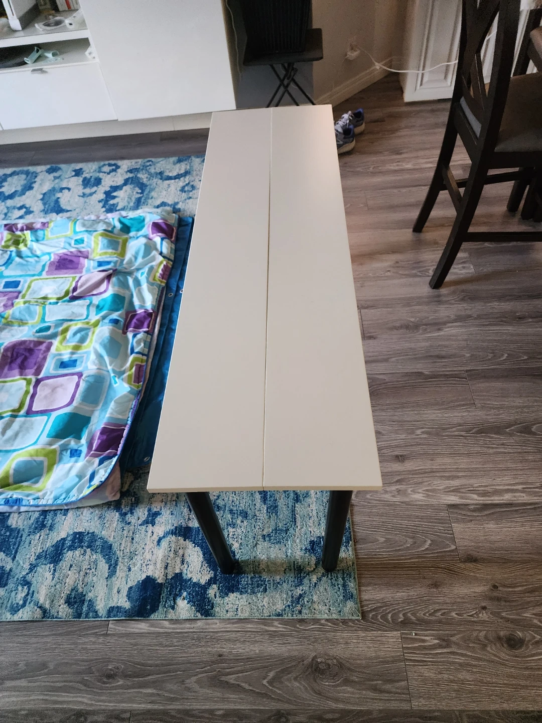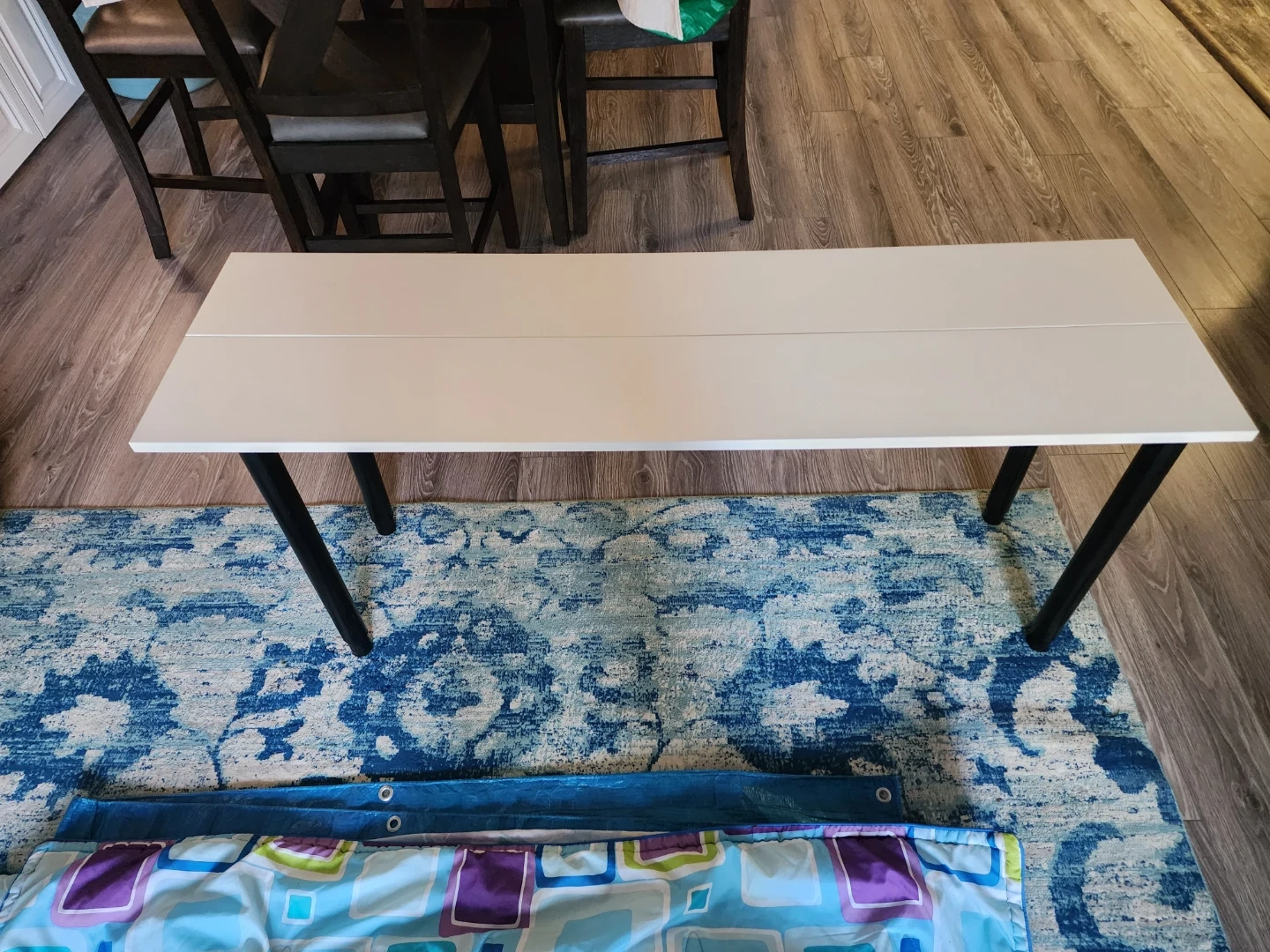 This is a narrow white table with black metal legs. It's a simple and modern design. It's a good size for small spaces.