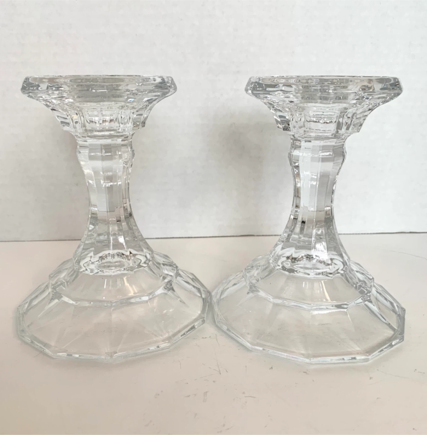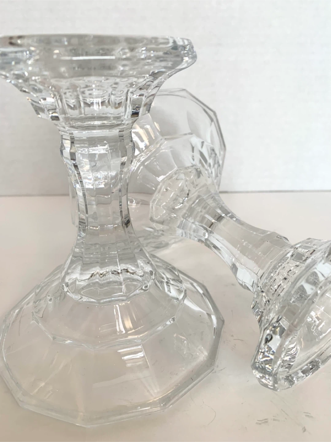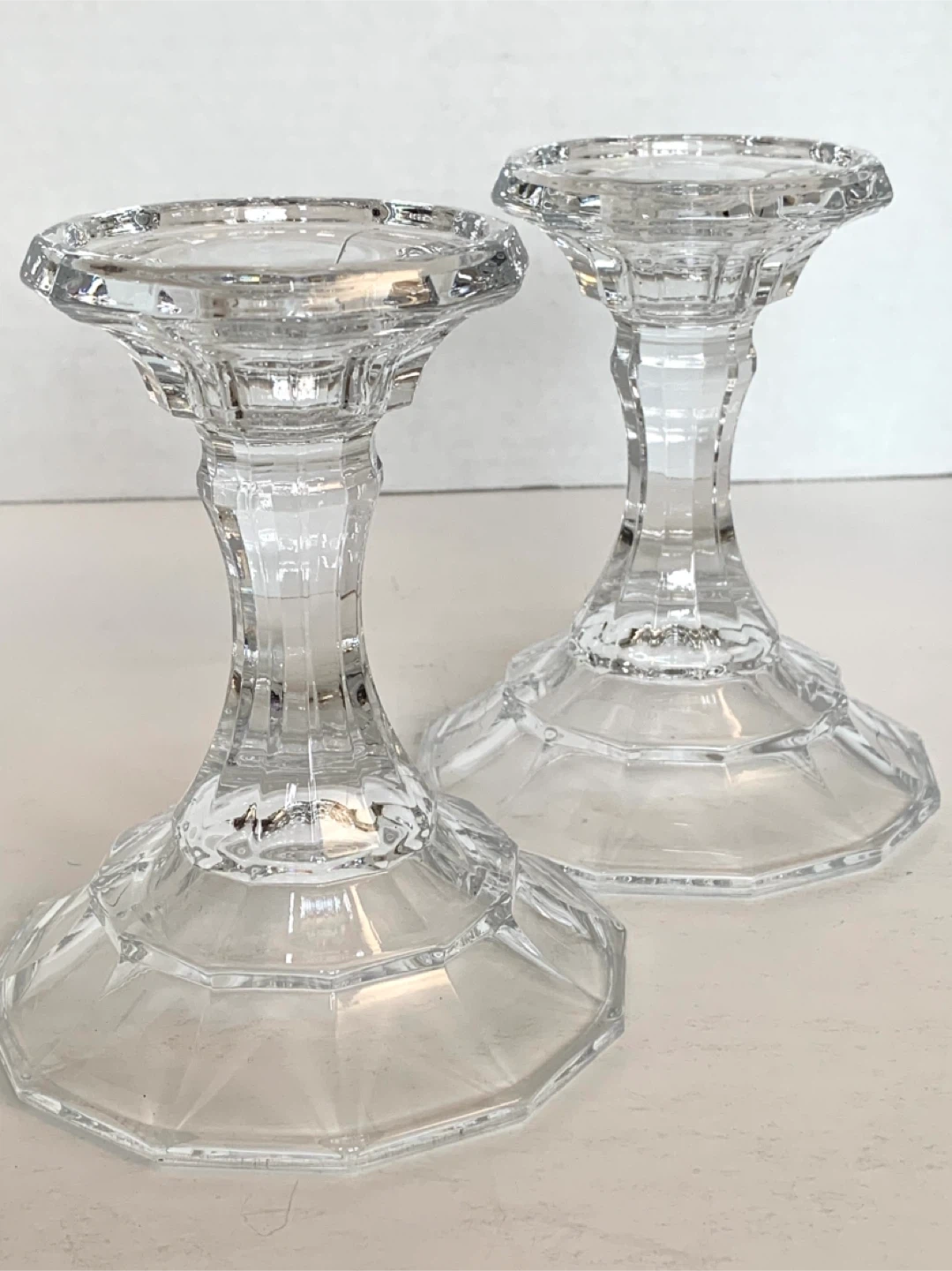 This is a set of two clear glass candlesticks. They have a faceted design on the base and stem. Made of glass.